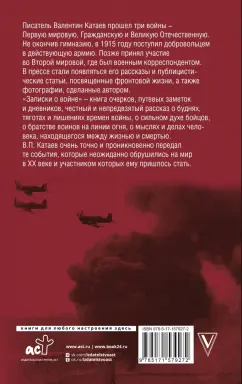 ОписаниеПисатель Валентин Катаев прошел три войны – Первую мировую, Гражданскую и Великую Отечественную. Не окончив гимназию, в 1915 году поступил добровольцем в действующую армию. Позже принял участие во Второй мировой, где был военным корреспондентом.В прессе стали появляться его рассказы и публицистические статьи, посвященные фронтовой жизни, а также фотографии, сделанные автором.«Записки о войне» – книга очерков, путевых заметок и дневников, честный и непредвзятый рассказ о буднях, тяготах и лишениях времен войны, о сильном духе бойцов, о братстве воинов на линии огня, о мыслях и делах человека, находящегося между жизнью и смертью.В.П. Катаев очень точно и проникновенно передал те события, которые неожиданно обрушились на мир в XX веке и участником которых ему пришлось стать.Писатель Валентин Катаев прошел три войны – Первую мировую, Гражданскую и Великую Отечественную. Не окончив гимназию, в 1915 году поступил добровольцем в действующую армию. Позже принял участие во Второй мировой, где был военным корреспондентом.В прессе стали появляться его рассказы и публицистические статьи, посвященные фронтовой жизни, а также фотографии, сделанные автором.«Записки о войне» – книга очерков, путевых заметок и дневников, честный и непредвзятый рассказ о буднях, тяготах и лишениях времен войны, о сильном духе бойцов, о братстве воинов на линии огня, о мыслях и делах человека, находящегося между жизнью и смертью.В.П. Катаев очень точно и проникновенно передал те события, которые неожиданно обрушились на мир в XX веке и участником которых ему пришлось стать.