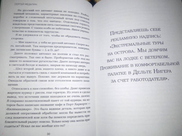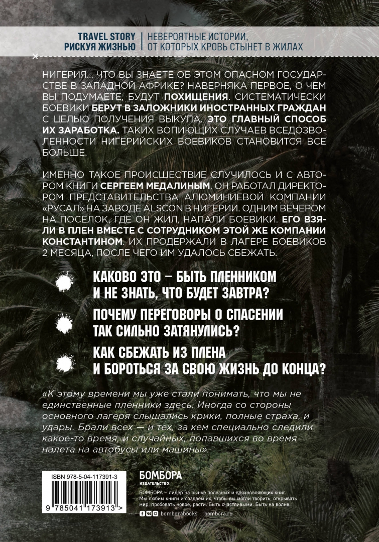 ОписаниеНигерия… Вы никогда не задумывались о том, сколько на самом деле криминала происходит в этом опасном государстве Западной Африки? Похищения, терроризм, убийства и пытки. Систематически боевики берут в заложники иностранных граждан с целью получения выкупа. Это - главный способ их заработка. С каждым годом людей пропадает все больше, а шансов спастись все меньше. Автор книги, Сергей Медалин, пробыл в плену 2 месяца. Как ему удалось остаться в живых и совершить побег, а главное, сохранить рассудок?Нигерия… Вы никогда не задумывались о том, сколько на самом деле криминала происходит в этом опасном государстве Западной Африки? Похищения, терроризм, убийства и пытки. Систематически боевики берут в заложники иностранных граждан с целью получения выкупа. Это - главный способ их заработка. С каждым годом людей пропадает все больше, а шансов спастись все меньше. Автор книги, Сергей Медалин, пробыл в плену 2 месяца. Как ему удалось остаться в живых и совершить побег, а главное, сохранить рассудок?