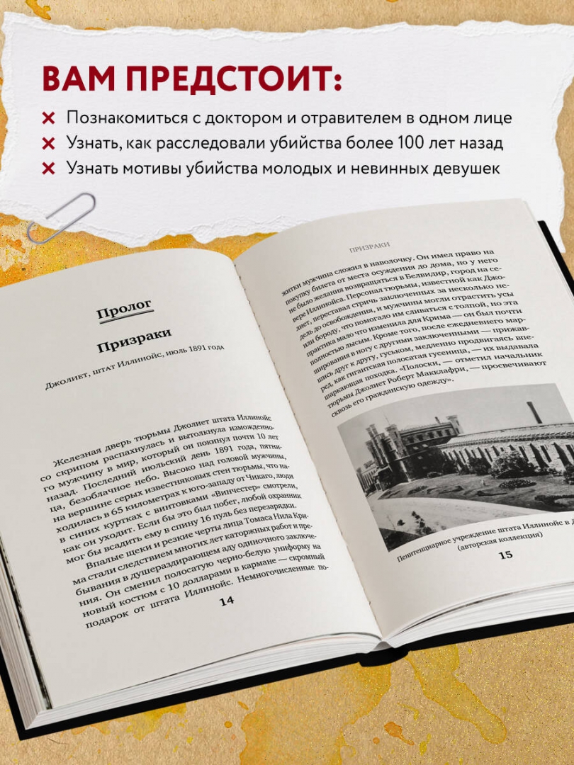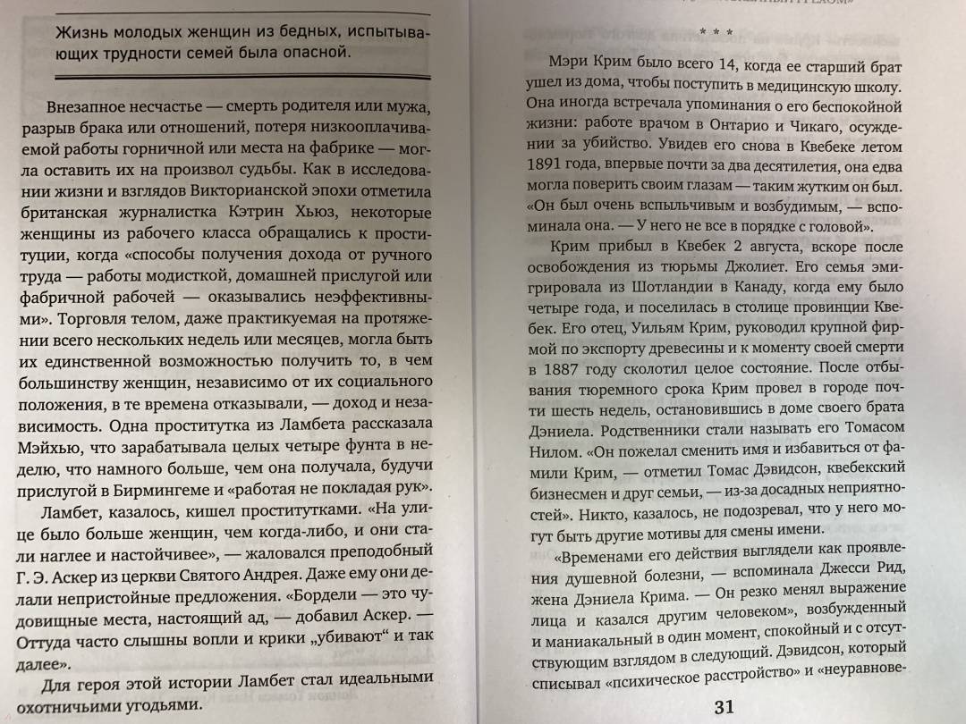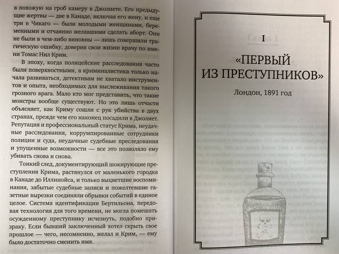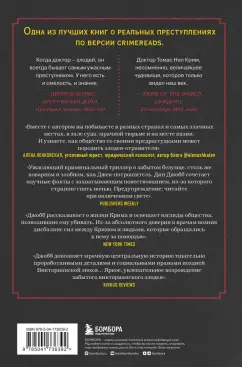 ОписаниеОдна из самых ожидаемых книг 2021 года! Одна из лучших книг о реальных преступлениях по версии Crimereads, 2021 год. Входит в топ-10 лучших подарков для любителей криминала - по версии сайта независимого кино Indiewire. "Когда доктор - злодей, он всегда бывает самым ужасным преступником. У него есть и смелость, и знание". - Шерлок Холмс, Артур Конан Дойл, "Пестрая лента", 1892 год"Доктор Томас Нил Крим, несомненно, величайшее чудовище, которое только видел наш век". - News of the World (Лондон), 23 октября 1892 года"Ужасающий криминальный триллер о забытом безумце, столь же коварном и злобном, как Джек-потрошитель. Дин Джобб сочетает научные факты с захватывающим повествованием, из-за которого страшно спать ночью. Предупреждение: читайте при включенном свете". - Publishers Weekly"Джобб рассказывает о жизни Крима и освещает взгляды общества, позволившие ему убивать. Из-за абсолютного доверия к врачам возник дисбаланс сил между Кримом и людьми, которые обращались к нему за помощью". - New York Times"Джобб дополняет мрачную центральную историю тщательно проработанными деталями и социальными нравами поздней Викторианской эпохи… Яркое, увлекательное возрождение забытого викторианского злодея". - Kirkus Reviews"Леденящая кровь и захватывающая книга… Криминальные истории Джобба нельзя оставлять без внимания". - Crimereads"Невероятно увлекательное расследование преступлений одного из самых жестоких серийных убийц Великобритании. Рассказанная в духе готического романа, эта история никого не оставит равнодушным. Вместе с автором вы побываете в разных странах и самых злачных местах, в зале суда, мрачной тюрьме и на месте казни. И узнаете, как общество со своими предрассудками может породить злодея-отравителя". - Алена Ленковская, уголовный юрист, юридический психолог, автор блога @alenushkalenСвернутьОдна из самых ожидаемых книг 2021 года! Одна из лучших книг о реальных преступлениях по версии Crimereads, 2021 год. Входит в топ-10 лучших подарков для любителей криминала - по версии сайта независимого кино Indiewire. "Когда доктор - злодей, он всегда бывает самым ужасным преступником. У него есть и смелость, и знание". - Шерлок Холмс, Артур Конан Дойл, "Пестрая лента", 1892 год"Доктор Томас Нил Крим, несомненно, величайшее чудовище, которое только видел наш век". - News of the World (Лондон), 23 октября 1892 года"Ужасающий криминальный триллер о забытом безумце, столь же коварном и злобном, как Джек-потрошитель. Дин Джобб сочетает научные факты с захватывающим повествованием, из-за которого страшно спать ночью. Предупреждение: читайте при включенном свете". - Publishers Weekly"Джобб рассказывает о жизни Крима и освещает взгляды общества, позволившие ему убивать. Из-за абсолютного доверия к врачам возник дисбаланс сил между Кримом и людьми, которые обращались к нему за помощью". - New York Times"Джобб дополняет мрачную центральную историю тщательно проработанными деталями и социальными нравами поздней Викторианской эпохи… Яркое, увлекательное возрождение забытого викторианского злодея". - Kirkus Reviews"Леденящая кровь и захватывающая книга… Криминальные истории Джобба нельзя оставлять без внимания". - Crimereads"Невероятно увлекательное расследование преступлений одного из самых жестоких серийных убийц Великобритании. Рассказанная в духе готического романа, эта история никого не оставит равнодушным. Вместе с автором вы побываете в разных странах 