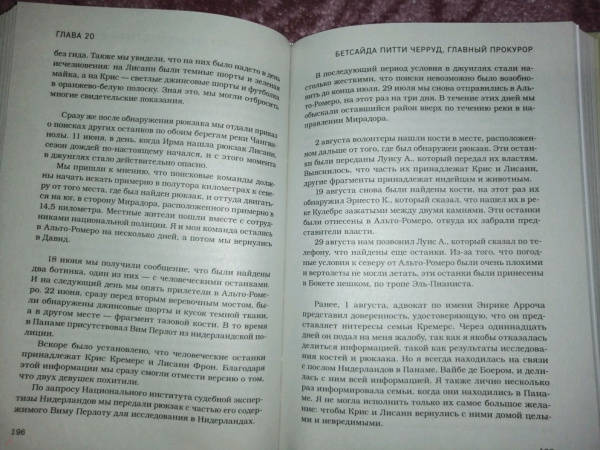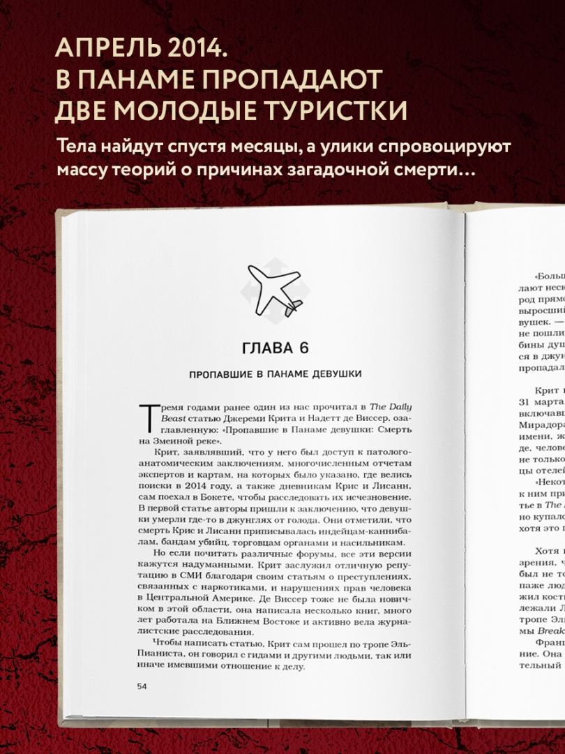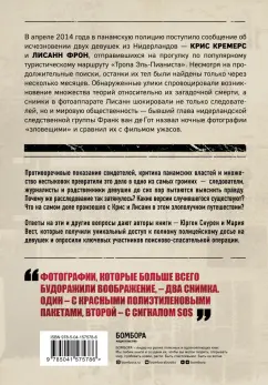 ОписаниеВ апреле 2014 года в панамскую полицию поступило сообщение об исчезновении двух девушек из Нидерландов - Крис Кремерс и Лисанн Фрон, отправившихся на прогулку по популярному туристическому маршруту "тропа Эль-Пианиста". Несмотря на продолжительные поиски, останки их тел были найдены только через несколько месяцев спустя, а обнаруженные улики спровоцировали возникновение множества теорий относительно их загадочной смерти. Следователей шокировали снимки в фотоаппарате Лиссан, найденном вместе с остальными вещами в рюкзаке. В нем оказалось 133 фотографии, сделанных в период с 1 по 8 апреля, а бывший глава нидерландской следственной группы Франк ван де Гот назвал ночные фотографии "зловещими" и сравнил их с фильмом ужасов. Противоречивые показания свидетелей, критика панамских властей и множество нестыковок превратили это дело в одно из самых громких - это исчезновение до сих пор продолжает изучаться следователями, журналистами и родственниками девушек. Почему же расследование так затянулось? Какие версии случившегося существуют? Что на самом деле произошло с Крис и Лисанн в этом злополучном путешествии? Ответы на эти и многие другие вопросы раскроют авторы книги - Юрген Снурен и Мария Вест.СвернутьВ апреле 2014 года в панамскую полицию поступило сообщение об исчезновении двух девушек из Нидерландов - Крис Кремерс и Лисанн Фрон, отправившихся на прогулку по популярному туристическому маршруту "тропа Эль-Пианиста". Несмотря на продолжительные поиски, останки их тел были найдены только через несколько месяцев спустя, а обнаруженные улики спровоцировали возникновение множества теорий относительно их загадочной смерти. Следователей шокировали снимки в фотоаппарате Лиссан, найденном вместе с остальными вещами в рюкзаке. В нем оказалось 133 фотографии, сделанных в период с 1 по 8 апреля, а бывший глава нидерландской следственной группы Франк ван де Гот назвал ночные фотографии "зловещими" и сравнил их с фильмом ужасов. Противоречивые показания свидетелей, критика панамских властей и множество нестыковок превратили это дело в одно из самых громких - это исчезновение до сих пор продолжает изучаться следователями, журналистами и родственниками девушек. Почему же расследование так затянулось? Какие версии случившегося существуют? Что на самом деле произошло с Крис и Лисанн в этом злополучном путешествии? Ответы на эти и многие другие вопросы раскроют авторы книги - Юрген Снурен и Мария Вест.СвернутьСвернуть