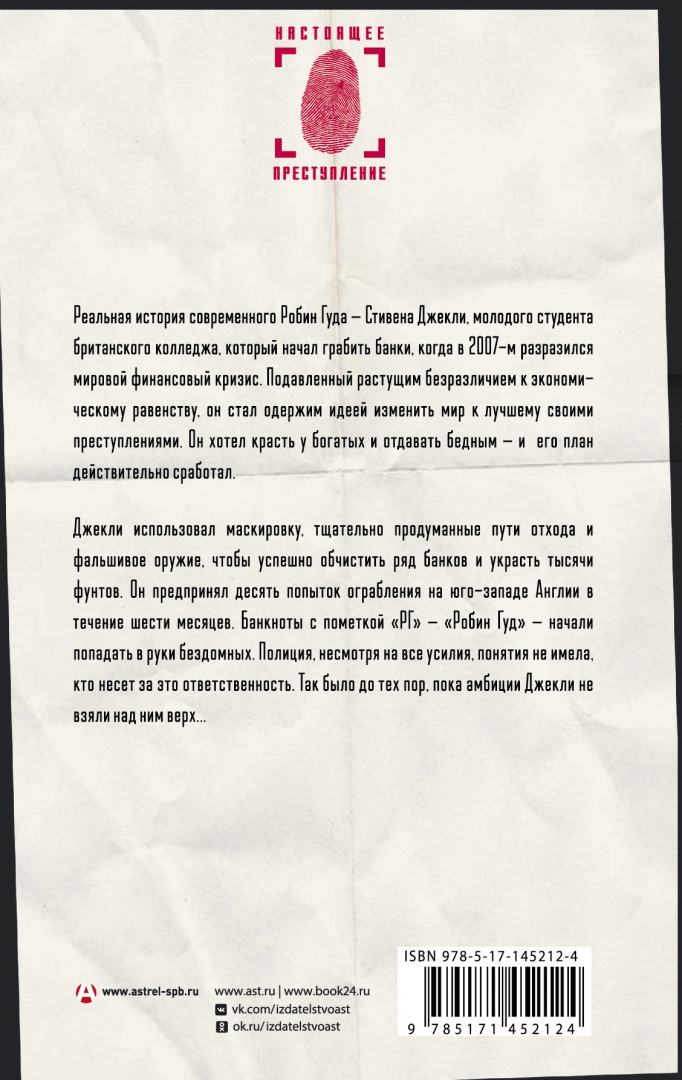 ОписаниеРеальная история современного Робин Гуда - Стивена Джекли, молодого студента британского колледжа, который начал грабить банки, когда в 2007-м разразился мировой финансовый кризис. Подавленный растущим безразличием к экономическому равенству, он стал одержим идеей изменить мир к лучшему своими преступлениями. Он хотел красть у богатых и отдавать бедным - и его план действительно сработал.Джекли использовал маскировку, тщательно продуманные пути отхода и фальшивое оружие, чтобы успешно обчистить ряд банков и украсть тысячи фунтов. Он предпринял десять попыток ограбления на юго-западе Англии в течение шести месяцев. Банкноты с пометкой "РГ" - "Робин Гуд" - начали попадать в руки бездомных. Полиция, несмотря на все усилия, понятия не имела, кто несет за это ответственность. Так было до тех пор, пока амбиции Джекли не взяли над ним верх...Мировой финансовый кризис 2007 года сделал бедных еще беднее. А вот богатые? Некоторые из них лишь увеличили свое состояние. Молодой студент Стивен Джекли решил помочь бедным и наказать богатых. С помощью маскировки и фальшивого оружия он обчищал крупнейшие лондонские банки: 10 ограблений за 6 месяцев.