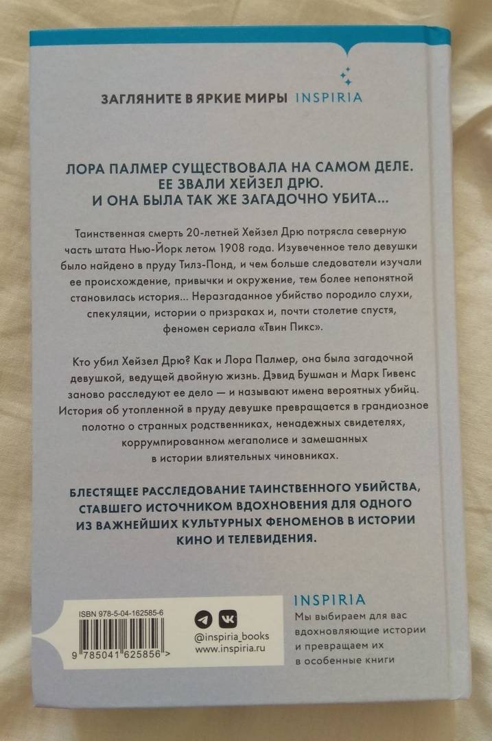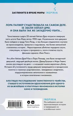 ОписаниеЛора Палмер существовала на самом деле.Её звали Хейзел Дрю.И она была так же загадочно убита.Летом 1908 года убийство Хейзел Дрю потрясло северную часть штата Нью-Йорк. Изувеченное тело двадцатилетней девушки было найдено в пруду, и чем больше следователи изучали ее происхождение, привычки и окружение, тем более непонятной становилась история... Неразгаданное убийство породило слухи, спекуляции, истории о призраках и, почти столетие спустя, феномен сериала "Твин Пикс". Один из сценаристов сериала, Марк Фрост, воплотил образ Хейзел Дрю, о которой часто слышал в детстве от своих бабушки и дедушки, в образе Лоры Палмер...Кто убил Хейзел Дрю? Как и Лора Палмер, она была загадочной девушкой, ведущей двойную жизнь. Дэвид Бушман и Марк Гивенс заново расследуют ее дело - и называют имена вероятных убийц. История об утопленной в пруду Тилз-Понд девушке превращается в грандиозное полотно о странных родственниках, ненадежных свидетелях, коррумпированном мегаполисе и замешанных в истории влиятельных чиновниках. Блестяще проработанное расследование таинственного убийства, ставшего источником вдохновения для одного из важнейших культурных феноменов в истории кино и телевидения.В тщательно проработанной книге Дэвида Бушмана и Марка Гивенса двойником Лоры Палмер является Хейзел Дрю, юная красавица с темными секретами, найденная мертвой в пруду недалеко от Олбани в 1908 году. Сто пятнадцать лет спустя Бушмен и Гивенс, шаг за шагом, подозреваемый за подозреваемым, раскрывают тайну ее нераскрытого убийства.Vanity FairКто убил двадцатилетнюю Хейзел Дрю и оставил ее тело в пруду на севере штата Нью-Йорк в 1908 году? В этом остросюжетном криминальном романе Бушман и Гивенс расследуют убийство, которое вдохновило на создание культового телесериала "Твин Пикс". Авторы эффективно обобщают пять лет исследований, используя ряд источников, и рисуют убедительную картину событий, которая заставляет читателей чувствовать, что они наблюдают за событиями в реальном времени.Publishers WeeklyСвернутьЛора Палмер существовала на самом деле.Её звали Хейзел Дрю.И она была так же загадочно убита.Летом 1908 года убийство Хейзел Дрю потрясло северную часть штата Нью-Йорк. Изувеченное тело двадцатилетней девушки было найдено в пруду, и чем больше следователи изучали ее происхождение, привычки и окружение, тем более непонятной становилась история... Неразгаданное убийство породило слухи, спекуляции, истории о призраках и, почти столетие спустя, феномен сериала "Твин Пикс". Один из сценаристов сериала, Марк Фрост, воплотил образ Хейзел Дрю, о которой часто слышал в детстве от своих бабушки и дедушки, в образе Лоры Палмер...Кто убил Хейзел Дрю? Как и Лора Палмер, она была загадочной девушкой, ведущей двойную жизнь. Дэвид Бушман и Марк Гивенс заново расследуют ее дело - и называют имена вероятных убийц. История об утопленной в пруду Тилз-Понд девушке превращается в грандиозное полотно о странных родственниках, ненадежных свидетелях, коррумпированном мегаполисе и замешанных в истории влиятельных чиновниках. Блестяще проработанное расследование таинственного убийства, ставшего источником вдохновения для одного из важнейших культурных феноменов в истории кино и телевидения.В тщательно проработанной книге Дэвида Бушмана и Марка Гивенса двойником Лоры Палмер является Хейз
