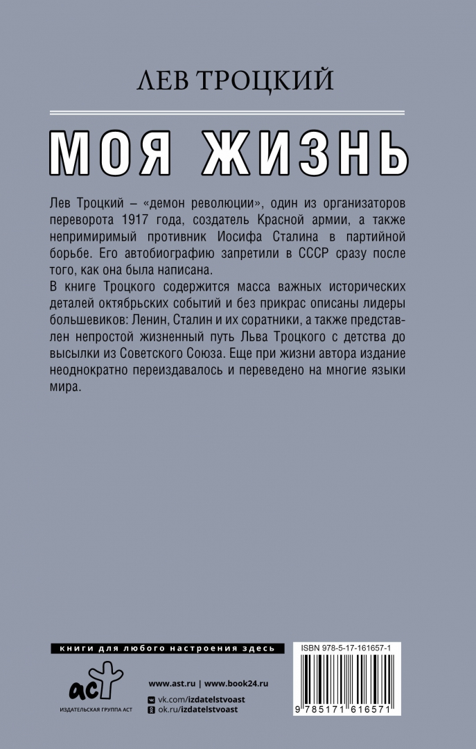 ОписаниеЛев Троцкий - "демон революции", один из организаторов переворота 1917 года, создатель Красной Армии, а также непримиримый противник Иосифа Сталина в партийной борьбе. Его автобиографию запретили в СССР сразу после того, как она была написана. В книге Троцкого содержится масса важных исторических деталей октябрьских событий, и без прикрас описаны лидеры большевиков: Ленин, Сталин и их соратники, а также представлен не простой жизненный путь Льва Троцкого - с детства до высылки из Советского Союза. Еще при жизни автора издание неоднократно переиздавалась и переведена на многие языки мира.Лев Троцкий - "демон революции", один из организаторов переворота 1917 года, создатель Красной Армии, а также непримиримый противник Иосифа Сталина в партийной борьбе. Его автобиографию запретили в СССР сразу после того, как она была написана. В книге Троцкого содержится масса важных исторических деталей октябрьских событий, и без прикрас описаны лидеры большевиков: Ленин, Сталин и их соратники, а также представлен не простой жизненный путь Льва Троцкого - с детства до высылки из Советского Союза. Еще при жизни автора издание неоднократно переиздавалась и переведена на многие языки мира.