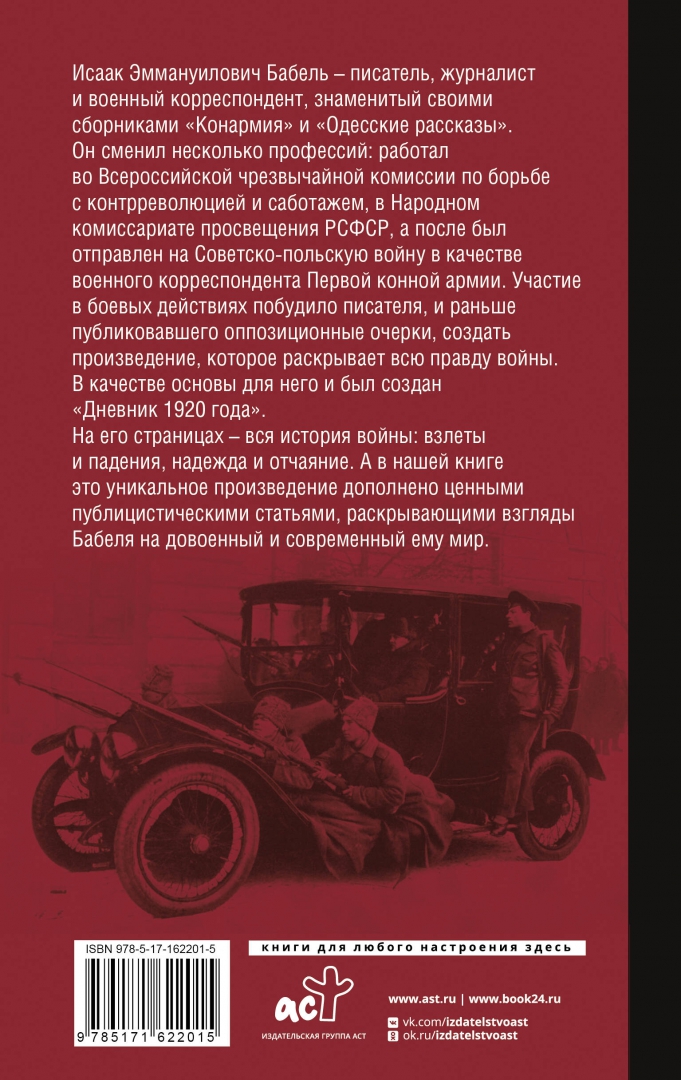 ОписаниеИсаак Эммануилович Бабель - писатель, журналист и военный корреспондент, знаменитый своими сборниками "Конармия" и "Одесские рассказы".Он сменил несколько профессий: работал во Всероссийской чрезвычайной комиссии по борьбе с контрреволюцией и саботажем, в Народном комиссариате просвещения РСФСР, а после был отправлен на Советско-польскую войну в качестве военного корреспондента Первой конной армии. Участие в боевых действиях побудило писателя, и раньше публиковавшего оппозиционные очерки, создать произведение, которое раскрывает всю правду войны.В качестве основы для него и был создан "Дневник 1920 года". На его страницах - вся история войны: взлеты и падения, надежда и отчаяние. А в нашей книге это уникальное произведение дополнено ценными публицистическими статьями, раскрывающими взгляды Бабеля на довоенный и современный ему мир.Исаак Эммануилович Бабель - писатель, журналист и военный корреспондент, знаменитый своими сборниками "Конармия" и "Одесские рассказы".Он сменил несколько профессий: работал во Всероссийской чрезвычайной комиссии по борьбе с контрреволюцией и саботажем, в Народном комиссариате просвещения РСФСР, а после был отправлен на Советско-польскую войну в качестве военного корреспондента Первой конной армии. Участие в боевых действиях побудило писателя, и раньше публиковавшего оппозиционные очерки, создать произведение, которое раскрывает всю правду войны.В качестве основы для него и был создан "Дневник 1920 года". На его страницах - вся история войны: взлеты и падения, надежда и отчаяние. А в нашей книге это уникальное произведение дополнено ценными публицистическими статьями, раскрывающими взгляды Бабеля на довоенный и современный ему мир.