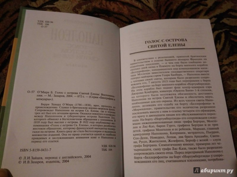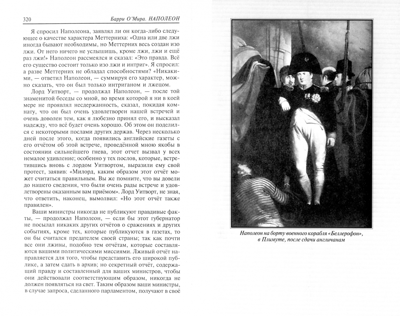 ОписаниеБарри Эдвард О'Мира (1786-1836), врач, ирландец по происхождению. Служил в британском военно-морском флоте. Сопровождал Наполеона на остров Св. Елены, где в течение трех лет был его лечащим врачом. Оказался вовлечен в конфликт между Наполеоном и губернатором острова Хадсоном Лоу, которого обвинял в бесчеловечном обращении с пленником. В 1818 году был выслан с острова. В 1822 году опубликовал воспоминания "Голос с острова Св. Елены", в которых разоблачил жестокое обращение, которому французский император подвергался на острове. Книга сразу же стала бестселлером и выдержала множество изданий. Она по праву считается одной из наиболее правдивых и заслуживающих внимания книг о Наполеоне в период его ссылки.Барри Эдвард О'Мира (1786-1836), врач, ирландец по происхождению. Служил в британском военно-морском флоте. Сопровождал Наполеона на остров Св. Елены, где в течение трех лет был его лечащим врачом. Оказался вовлечен в конфликт между Наполеоном и губернатором острова Хадсоном Лоу, которого обвинял в бесчеловечном обращении с пленником. В 1818 году был выслан с острова. В 1822 году опубликовал воспоминания "Голос с острова Св. Елены", в которых разоблачил жестокое обращение, которому французский император подвергался на острове. Книга сразу же стала бестселлером и выдержала множество изданий. Она по праву считается одной из наиболее правдивых и заслуживающих внимания книг о Наполеоне в период его ссылки.