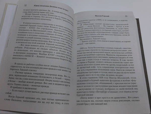 СвернутьЮрий Анненков (1889–1974), прекрасный график, живописец, театральный художник, начал свой творческий путь в 1910-е годы, быстро заняв видное место в культурном мире Петербурга. Повествуя о своих современниках, личностях выдающихся, с которыми его связала искренняя дружба, он постоянно говорит и о самом себе, и о том, как сложилась его жизненная история, его судьба. Написанные художником литературные портреты, по стилистике родственные его же талантливым графическим, украсившим книгу, называли «синтетическими образами», то есть предельно обобщенными, сконцентрированными на чем-то значительном. Своему дневнику Анненков дал подзаголовок, в котором отразил печальные линии биографий своих персонажей.А это Максим Горький, Александр Блок, Николай Гумилев, Анна Ахматова, Георгий Иванов, Велимир Хлебников, Сергей Есенин, Владимир Маяковский, Евгений Замятин, Борис Пильняк, Исаак Бабель, Михаил Зощенко, Алексей Ремизов, Сергей Прокофьев, Илья Репин.И рядом с этими фигурами возникают десятки других, за частными историями встает история русской культуры на протяжении многих десятилетий.- В книге отражены трагические обстоятельства жизни российской интеллигенции начала XX в.