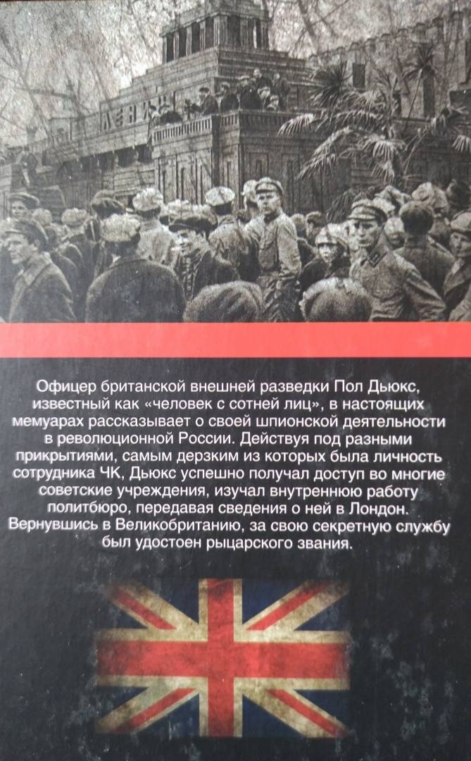 ОписаниеОфицер британской внешней разведки Пол Дьюкс, известный как "человек с сотней лиц", в настоящих мемуарах рассказывает о своей шпионской деятельности в революционной России. Действуя под разными прикрытиями, самым дерзким из которых была личность сотрудника ЧК, Дьюкс успешно получал доступ во многие советские учреждения, изучал внутреннюю работу Политбюро, передавая сведения о ней в Лондон. Вернувшись в Великобританию, за свою секретную службу был удостоен рыцарского звания.Офицер британской внешней разведки Пол Дьюкс, известный как "человек с сотней лиц", в настоящих мемуарах рассказывает о своей шпионской деятельности в революционной России. Действуя под разными прикрытиями, самым дерзким из которых была личность сотрудника ЧК, Дьюкс успешно получал доступ во многие советские учреждения, изучал внутреннюю работу Политбюро, передавая сведения о ней в Лондон. Вернувшись в Великобританию, за свою секретную службу был удостоен рыцарского звания.