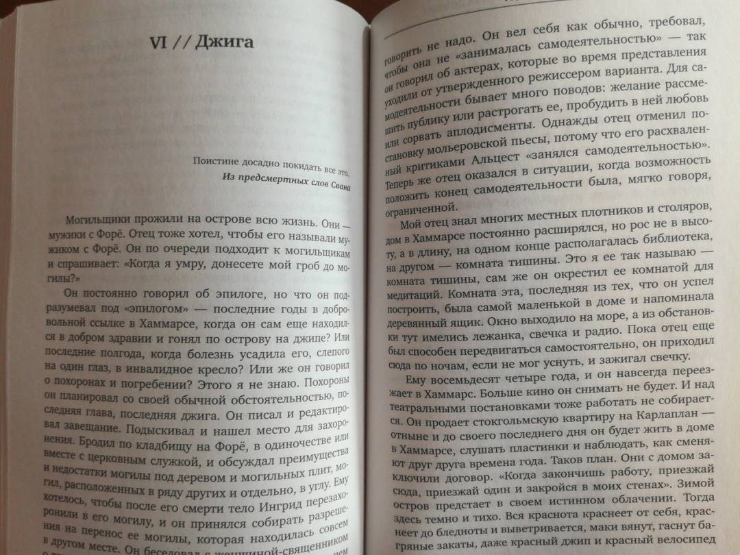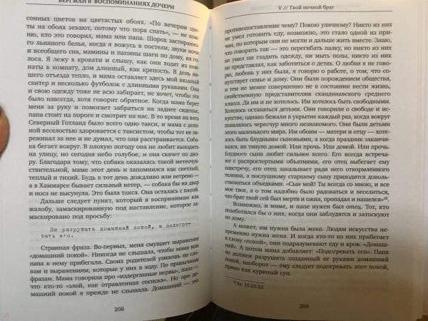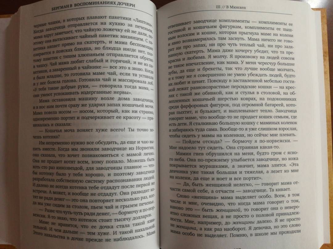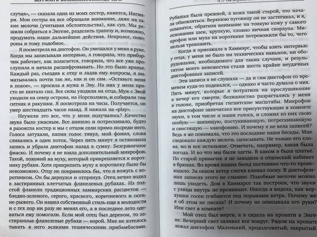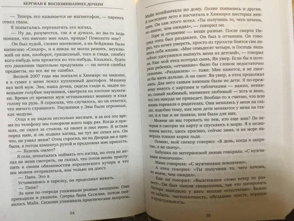 СвернутьКнига Лин Ульман, дочери Ингмара Бергмана и известной норвежской актрисы Лив Ульман – это тонкое сплетение воспоминаний и интервью с отцом в последние годы его жизни, а также подробные описания дорогих Бергману мест на Форё, куда он приезжал летом, и где уединился в конце жизни. Ключевой темой интервью, которое Лин Ульман брала у отца, был процесс или, как она это сама называет, искусство старения. Ответы Бергмана вызвали у нее воспоминания о своем детстве, о матери, о поездках к отцу на Форё, о встречах с ее сводными сестрами и братьями, о ее собственном взрослении и постепенном осмыслении всего того, что происходило вокруг нее.Лин Ульман – одна из самых заметных писательниц скандинавской литературы, талантливая дочь знаменитых родителей: именитого шведского режиссера Ингмара Бергмана и норвежской актрисы Лив Ульман. Шесть из ее романов стали бестселлерами в ее родной Норвегии и за рубежом. Ее книги читают более, чем в 20-ти странах.