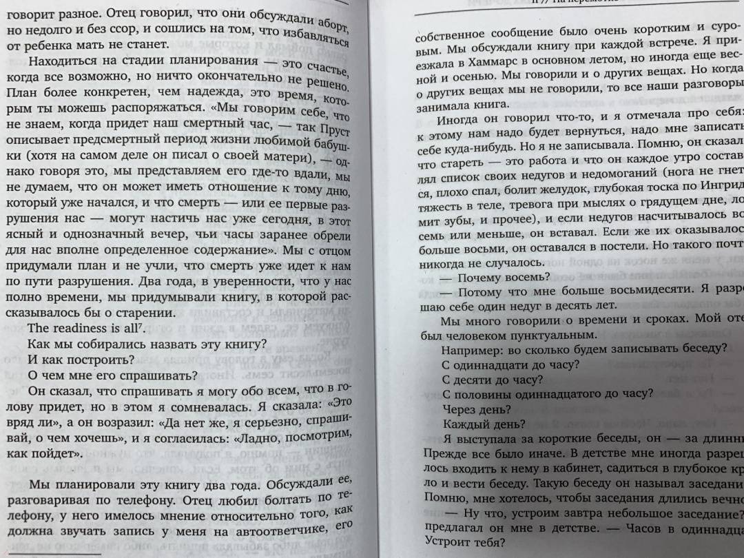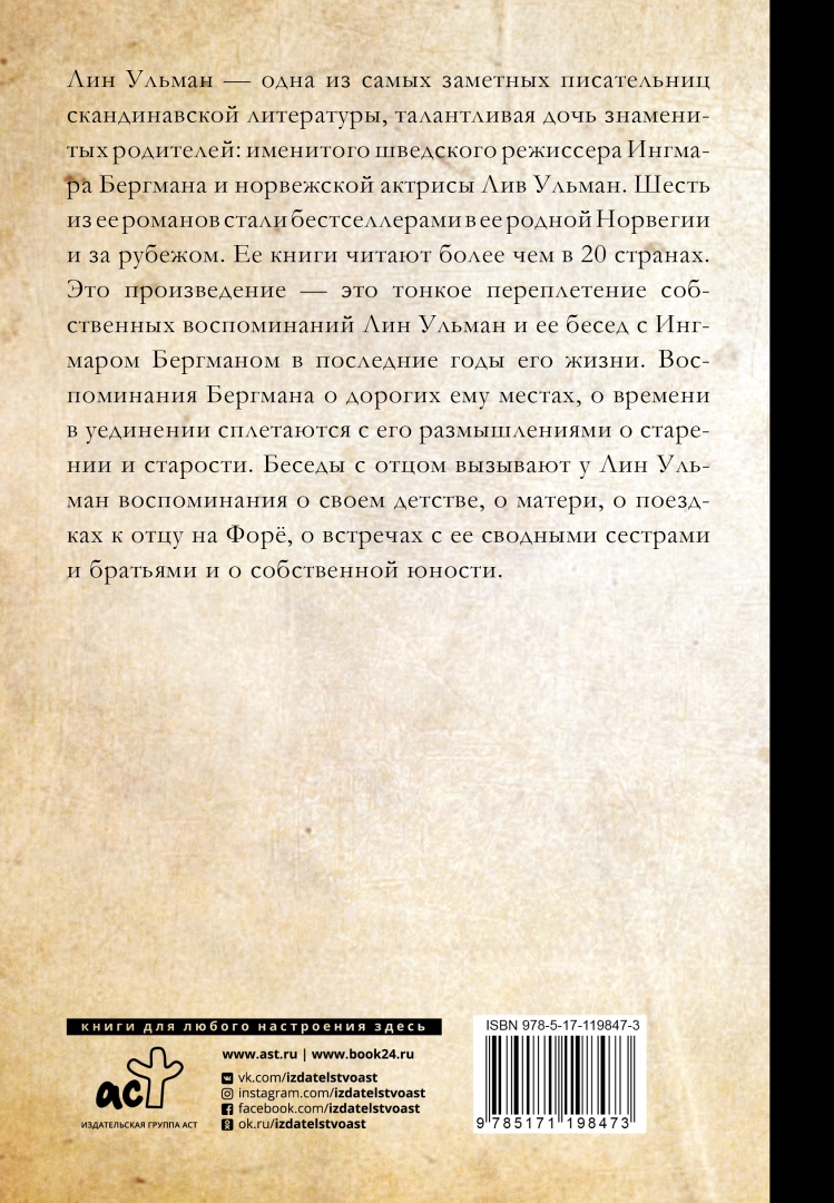 ОписаниеКнига Лин Ульман, дочери Ингмара Бергмана и известной норвежской актрисы Лив Ульман – это тонкое сплетение воспоминаний и интервью с отцом в последние годы его жизни, а также подробные описания дорогих Бергману мест на Форё, куда он приезжал летом, и где уединился в конце жизни. Ключевой темой интервью, которое Лин Ульман брала у отца, был процесс или, как она это сама называет, искусство старения. Ответы Бергмана вызвали у нее воспоминания о своем детстве, о матери, о поездках к отцу на Форё, о встречах с ее сводными сестрами и братьями, о ее собственном взрослении и постепенном осмыслении всего того, что происходило вокруг нее.Лин Ульман – одна из самых заметных писательниц скандинавской литературы, талантливая дочь знаменитых родителей: именитого шведского режиссера Ингмара Бергмана и норвежской актрисы Лив Ульман. Шесть из ее романов стали бестселлерами в ее родной Норвегии и за рубежом. Ее книги читают более, чем в 20-ти странах.