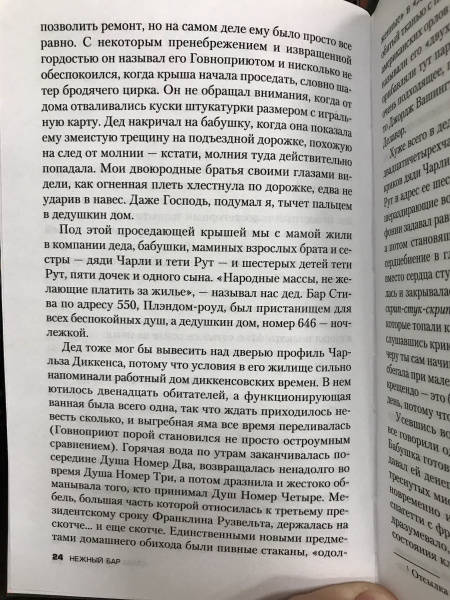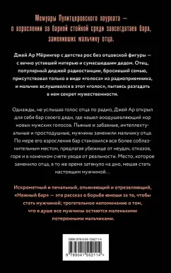 ОписаниеМировая премьера! Экранизация Джорджа Клуни, в ролях Бен Аффлек и Тай Шеридан. Мемуары Пулитцеровского лауреата - о взрослении за барной стойкой среди завсегдатаев бара, заменивших мальчику отца. Лучшая книга года по версии New York Times, Esquire, Entertainment Weekly, USA Today, New York Magazine. Бестселлер New York Times, Los Angeles Times, Wall Street Journal, San Francisco Chronicle, USA Today, Library Journal. Джей Ар Мёрингер с детства рос без отцовской фигуры - с вечно уставшей матерью и сумасшедшим дедом. Отец, популярный ди-джей радиостанции, бросивший семью, присутствовал только в виде "голоса" из радиоприемника, и мальчик вслушивался в этот "голос", пытаясь разгадать в нем секрет мужественности. Однажды, не услышав отца по радио, Джей Ар открыл для себя бар своего дяди, где нашел воодушевляющий хор новых мужских голосов. Пьяные и забавные, интеллектуальные и простодушные, мужчины заменили мальчику отца. По мере его взросления бар становился все более соблазнительным местом, предлагая убежище от неудач, отказов, горя - и, в конечном счете, уводя от реальности. Место, которое заменило отца, в то же время затянуло на дно, мешая стать настоящим мужчиной… Написанный в традициях прозы Фитцджеральда, Апдайка и Керуака, "Нежный бар" - это опьяняющий и отрезвляющий рассказ о борьбе юноши за то, чтобы стать мужчиной; трогательное напоминание о том, что в душе все мужчины остаются маленькими потерянными мальчиками. "Одновременно пронзительно и уморительно. "Нежный бар" начинается с воспевания салуна, который служит героям прибежищем во время жизненных бурь. И превращается в сложную, подробную историю о том, как человек трезвеет и взрослеет одновременно". - USA Today ""Нежный бар" - очаровательное, проникновенное любовное письмо к сбежавшему отцу, роман между мальчиком и баром на углу улицы, таким же прокуренным и задушевным, как голос Синатры в 1978-м". - The New York Times Book Review "Проникнутое любовью и в то же время честное отображение сообщества, которое может тебя разрушить или поддержать. Главное достоинство "Нежного бара" - великолепно переданные голоса, байки и фантазии забавных персонажей, которые, в отличие от автора, так никуда и не уехали из Манхассета - даже не попытались". - Minneapolis Star TribuneСвернутьМировая премьера! Экранизация Джорджа Клуни, в ролях Бен Аффлек и Тай Шеридан. Мемуары Пулитцеровского лауреата - о взрослении за барной стойкой среди завсегдатаев бара, заменивших мальчику отца. Лучшая книга года по версии New York Times, Esquire, Entertainment Weekly, USA Today, New York Magazine. Бестселлер New York Times, Los Angeles Times, Wall Street Journal, San Francisco Chronicle, USA Today, Library Journal. Джей Ар Мёрингер с детства рос без отцовской фигуры - с вечно уставшей матерью и сумасшедшим дедом. Отец, популярный ди-джей радиостанции, бросивший семью, присутствовал только в виде "голоса" из радиоприемника, и мальчик вслушивался в этот "голос", пытаясь разгадать в нем секрет мужественности. Однажды, не услышав отца по радио, Джей Ар открыл для себя бар своего дяди, где нашел воодушевляющий хор новых мужских голосов. Пьяные и забавные, интеллектуальные и простодушные, мужчины заменили мальчику отца. По мере его взросления бар становился все более соблазнительным местом, предлагая убежище от неудач, отказов, горя - и, в конечном счете, уводя от реальности. Место, которое заменило отца, в то же время затянуло на дно, мешая стать настоящим мужчиной… Написанный в традициях прозы Фитцджеральда, 