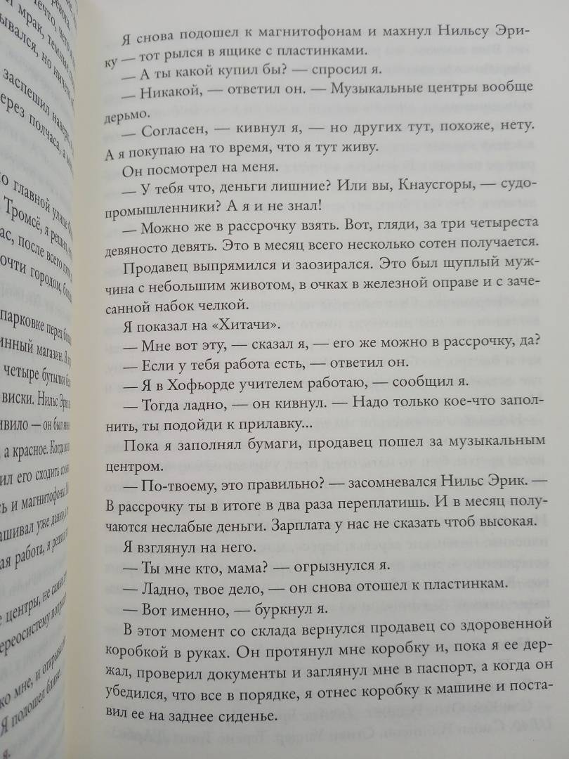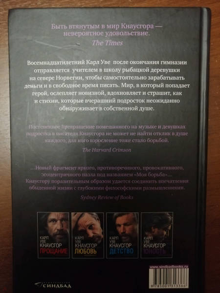ОписаниеЧетвертая книга монументального автобиографического цикла Карла Уве Кнаусгора "Моя борьба" рассказывает о юности главного героя и начале его писательского пути.Карлу Уве восемнадцать, он только что окончил гимназию, но получать высшее образование не намерен. Он хочет писать. В голове клубится множество замыслов, они так и рвутся на бумагу. Но, чтобы посвятить себя этому занятию, нужны деньги и свободное время. Он устраивается школьным учителем в маленькую рыбацкую деревню на севере Норвегии. Работа не очень ему нравится, деревенская атмосфера - еще меньше. Зато его окружает невероятной красоты природа, от которой захватывает дух. Поначалу все складывается неплохо: он сочиняет несколько новелл, его уважают местные парни, он популярен у девушек. Но когда окрестности накрывает полярная тьма, сводя доступное пространство к единственной деревенской улице, в душе героя воцаряется мрак. В надежде вернуть утраченное вдохновение он все чаще пьет с местными рыбаками, чтобы однажды с ужасом обнаружить у себя провалы в памяти - первый признак алкоголизма, сгубившего его отца. А на краю сознания все чаще и назойливее возникает соблазнительный образ влюбленной в Карла-Уве ученицы…СвернутьЧетвертая книга монументального автобиографического цикла Карла Уве Кнаусгора "Моя борьба" рассказывает о юности главного героя и начале его писательского пути.Карлу Уве восемнадцать, он только что окончил гимназию, но получать высшее образование не намерен. Он хочет писать. В голове клубится множество замыслов, они так и рвутся на бумагу. Но, чтобы посвятить себя этому занятию, нужны деньги и свободное время. Он устраивается школьным учителем в маленькую рыбацкую деревню на севере Норвегии. Работа не очень ему нравится, деревенская атмосфера - еще меньше. Зато его окружает невероятной красоты природа, от которой захватывает дух. Поначалу все складывается неплохо: он сочиняет несколько новелл, его уважают местные парни, он популярен у девушек. Но когда окрестности накрывает полярная тьма, сводя доступное пространство к единственной деревенской улице, в душе героя воцаряется мрак. В надежде вернуть утраченное вдохновение он все чаще пьет с местными рыбаками, чтобы однажды с ужасом обнаружить у себя провалы в памяти - первый признак алкоголизма, сгубившего его отца. А на краю сознания все чаще и назойливее возникает соблазнительный образ влюбленной в Карла-Уве ученицы…СвернутьСвернуть