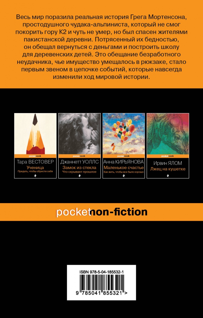 ОписаниеЛегендарный лонгселлер - теперь и в популярной серии Pocket book. "Три чашки чая" - это поразительная история о том, как самый обычный человек, не обладая ничем, кроме решительности, способен в одиночку изменить мир. Грег Мортенсон подрабатывал медбратом, ночевал в машине, а свое немногочисленное имущество держал в камере хранения. В память о погибшей сестре он решил покорить самую сложную гору К2. Эта попытка чуть не стоила ему жизни, если бы не помощь местных жителей. Несколько дней, проведенных в отрезанной от цивилизации пакистанской деревушке, потрясли Грега настолько, что он решил собрать необходимую сумму и вернуться в Пакистан, чтобы построить школу для деревенских детей. Сегодня Мортенсон руководит одной из самых успешных благотворительных организаций в мире, он построил 145 школ и несколько десятков женских и медицинских центров в самых бедных деревнях Пакистана и Афганистана. Книга была издана в 48 странах и в каждой из них стала бестселлером. Самого Грега Мортенсона дважды номинировали на Нобелевскую премию мира.СвернутьЛегендарный лонгселлер - теперь и в популярной серии Pocket book. "Три чашки чая" - это поразительная история о том, как самый обычный человек, не обладая ничем, кроме решительности, способен в одиночку изменить мир. Грег Мортенсон подрабатывал медбратом, ночевал в машине, а свое немногочисленное имущество держал в камере хранения. В память о погибшей сестре он решил покорить самую сложную гору К2. Эта попытка чуть не стоила ему жизни, если бы не помощь местных жителей. Несколько дней, проведенных в отрезанной от цивилизации пакистанской деревушке, потрясли Грега настолько, что он решил собрать необходимую сумму и вернуться в Пакистан, чтобы построить школу для деревенских детей. Сегодня Мортенсон руководит одной из самых успешных благотворительных организаций в мире, он построил 145 школ и несколько десятков женских и медицинских центров в самых бедных деревнях Пакистана и Афганистана. Книга была издана в 48 странах и в каждой из них стала бестселлером. Самого Грега Мортенсона дважды номинировали на Нобелевскую премию мира.СвернутьСвернуть