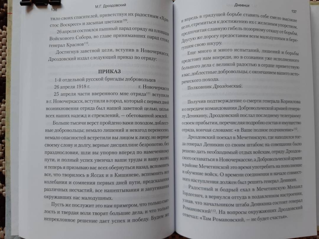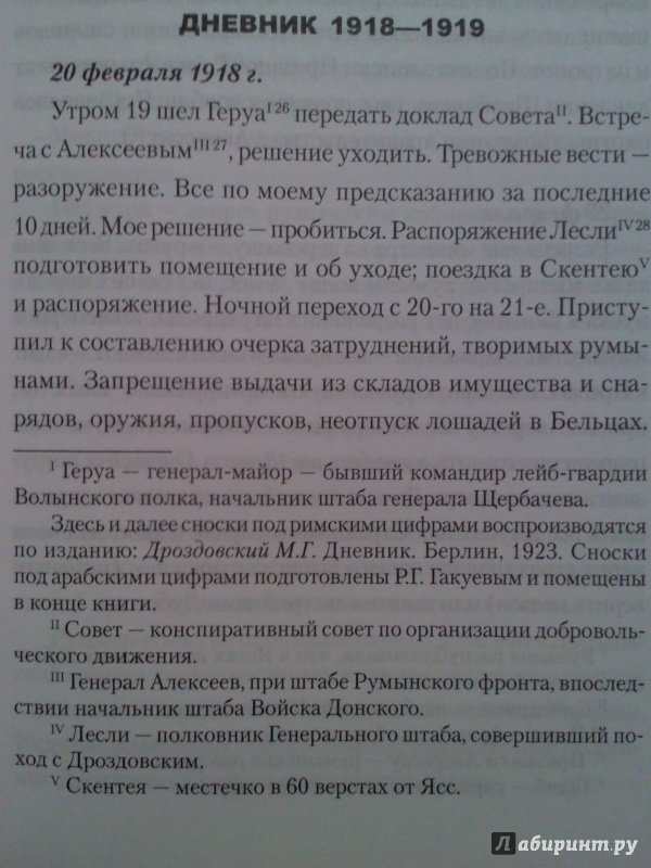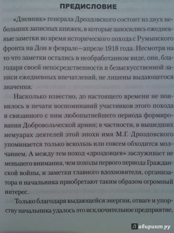 ОписаниеВоспоминания легендарного генерала М.Г. Дроздовского (1881-1919) рассказывают о событиях Гражданской войны в России и охватывают 1918-1919 гг. Особенно интересны впечатления автора о знаменитом походе дроздовцев - марше по маршруту Яссы - Дон. В качестве приложения к дневнику приводятся отрывочные записи за 1915-1917 гг., ярко характеризующие личность генерала, который стал легендой Белого движения.Воспоминания легендарного генерала М.Г. Дроздовского (1881-1919) рассказывают о событиях Гражданской войны в России и охватывают 1918-1919 гг. Особенно интересны впечатления автора о знаменитом походе дроздовцев - марше по маршруту Яссы - Дон. В качестве приложения к дневнику приводятся отрывочные записи за 1915-1917 гг., ярко характеризующие личность генерала, который стал легендой Белого движения.