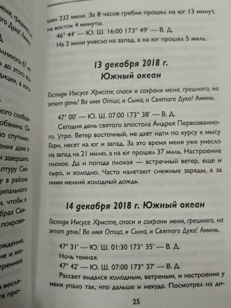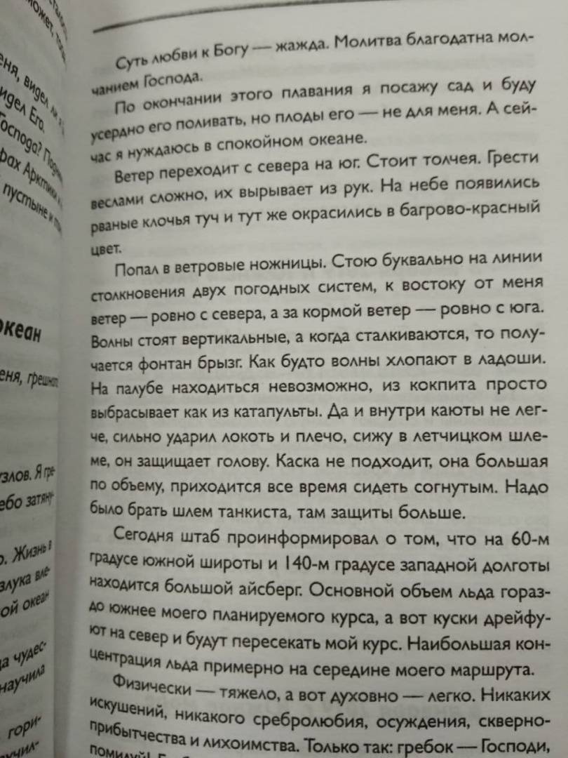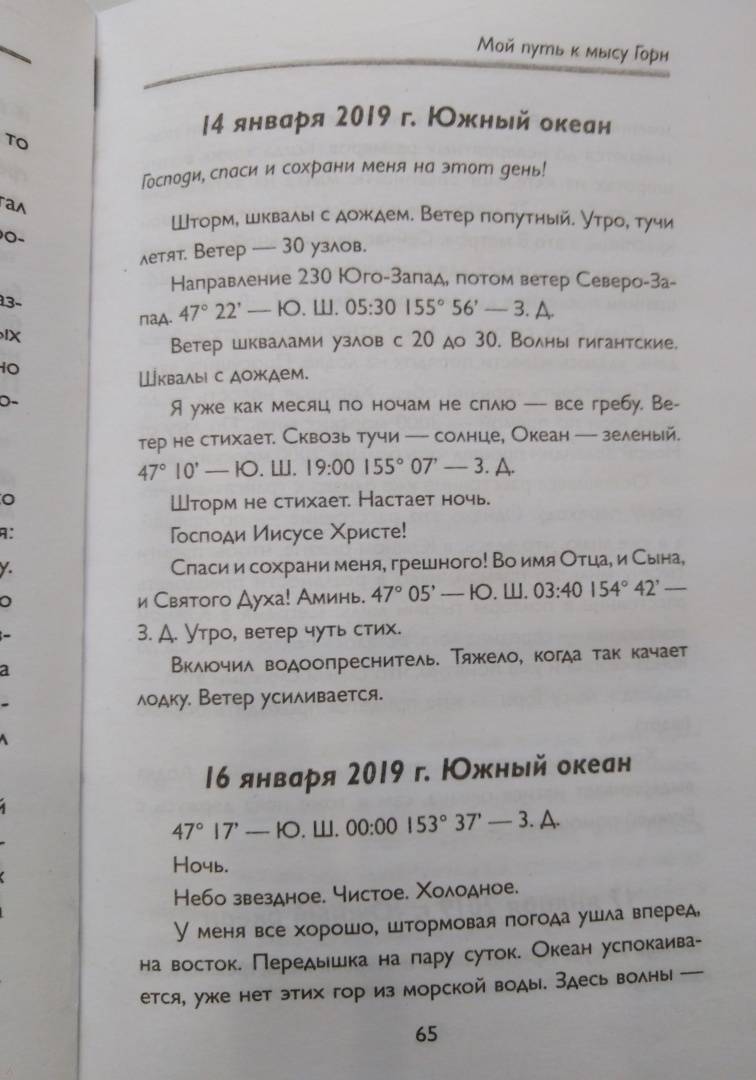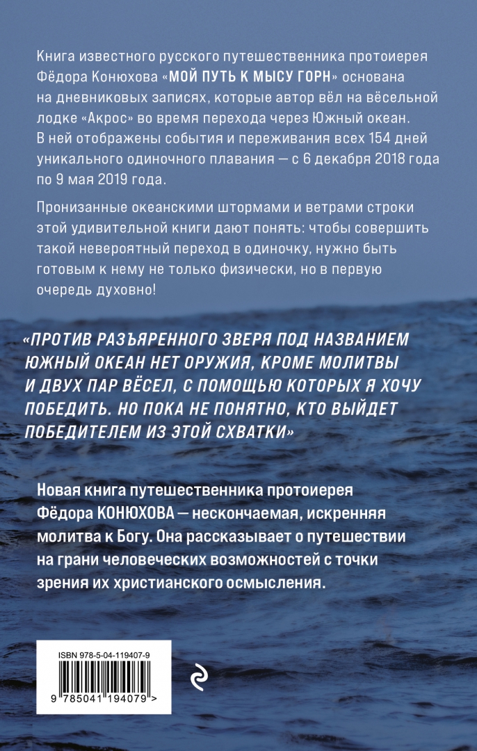 ОписаниеКнига известного русского путешественника протоиерея Фёдора Конюхова "Мой путь к мысу Горн" основана на дневниковых записях, которые автор вёл на вёсельной лодке "Акрос" во время перехода через Южный океан. В ней отображены события и переживания всех 154-х дней уникального одиночного плавания -с 6 декабря 2018 года по 9 мая 2019 года.Пронизанные океанскими штормами и ветрами строки этой удивительной книги дают понять: чтобы совершить такой невероятный переход в одиночку, нужно быть готовым к нему не только физически, но, в первую очередь, духовно! Перегрести целый океан, который отличается своими постоянными штормами и суровой погодой - как всё это непросто и опасно!..Новая книга путешественника и протоиерея Фёдора Конюхова - нескончаемая, искренняя и чистая молитва к Богу. Она рассказывает о путешествии на грани человеческих возможностей с точки зрения их христианского осмысления.Книга известного русского путешественника протоиерея Фёдора Конюхова "Мой путь к мысу Горн" основана на дневниковых записях, которые автор вёл на вёсельной лодке "Акрос" во время перехода через Южный океан. В ней отображены события и переживания всех 154-х дней уникального одиночного плавания -с 6 декабря 2018 года по 9 мая 2019 года.Пронизанные океанскими штормами и ветрами строки этой удивительной книги дают понять: чтобы совершить такой невероятный переход в одиночку, нужно быть готовым к нему не только физически, но, в первую очередь, духовно! Перегрести целый океан, который отличается своими постоянными штормами и суровой погодой - как всё это непросто и опасно!..Новая книга путешественника и протоиерея Фёдора Конюхова - нескончаемая, искренняя и чистая молитва к Богу. Она рассказывает о путешествии на грани человеческих возможностей с точки зрения их христианского осмысления.