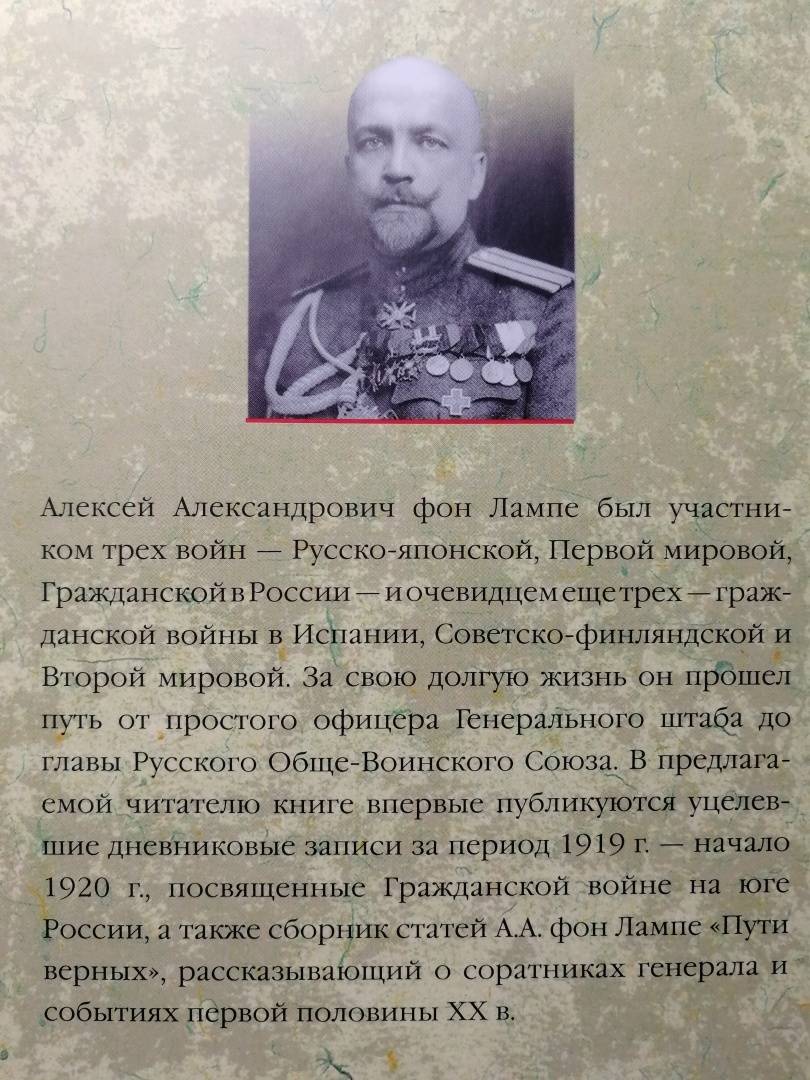 ОписаниеАлексей Александрович фон Лампе был участником трех войн — Русско-японской, Первой мировой, Гражданской в России и очевидцем еще трех — гражданской войны в Испании, Советско-финляндской и Второй мировой. За свою долгую жизнь он прошел путь от простого офицера Генерального штаба до главы Русского Обще-Воинского Союза. В предлагаемой читателю книге впервые публикуются уцелевшие дневниковые записи за период 1919 г. — начало 1920 г., посвященные Гражданской войне на юге России, а также сборник статей А.А. фон Лампе «Пути верных», рассказывающий о соратниках генерала и событиях первой половины ХХ в.Алексей Александрович фон Лампе был участником трех войн — Русско-японской, Первой мировой, Гражданской в России и очевидцем еще трех — гражданской войны в Испании, Советско-финляндской и Второй мировой. За свою долгую жизнь он прошел путь от простого офицера Генерального штаба до главы Русского Обще-Воинского Союза. В предлагаемой читателю книге впервые публикуются уцелевшие дневниковые записи за период 1919 г. — начало 1920 г., посвященные Гражданской войне на юге России, а также сборник статей А.А. фон Лампе «Пути верных», рассказывающий о соратниках генерала и событиях первой половины ХХ в.