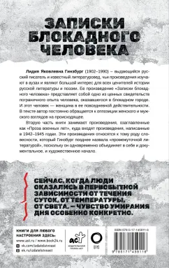 ОписаниеЛидия Яковлевна Гинзбург (1902-1990) - выдающийся русский писатель и известный литературовед, чьи произведения изучают в вузах и являют большой интерес для всех ценителей истории русской литературы и поэзии. Ее произведение "Записки блокадного человека" представляет собой одно из ценных свидетельств пограничного опыта человека, оказавшегося в блокадном городе. И этот человек - женщина в ее повседневной действительности. В тексте автор постоянный обращается к оппозиции женского и мужского взглядов на происходящее.Вторую часть книги занимают произведения, озаглавленные как "Проза военных лет", куда входят произведения, написанные в 1942-1945 годах. Эти произведения относятся к тому роду словесности, который Гинзбург позднее назвала "промежуточной литературой", поскольку он одновременно объединяет в себе и документальное, и художественное начало.Лидия Яковлевна Гинзбург (1902-1990) - выдающийся русский писатель и известный литературовед, чьи произведения изучают в вузах и являют большой интерес для всех ценителей истории русской литературы и поэзии. Ее произведение "Записки блокадного человека" представляет собой одно из ценных свидетельств пограничного опыта человека, оказавшегося в блокадном городе. И этот человек - женщина в ее повседневной действительности. В тексте автор постоянный обращается к оппозиции женского и мужского взглядов на происходящее.Вторую часть книги занимают произведения, озаглавленные как "Проза военных лет", куда входят произведения, написанные в 1942-1945 годах. Эти произведения относятся к тому роду словесности, который Гинзбург позднее назвала "промежуточной литературой", поскольку он одновременно объединяет в себе и документальное, и художественное начало.