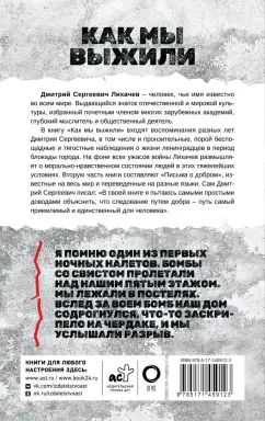 ОписаниеДмитрий Сергеевич Лихачев - человек, чье имя известно во всем мире. Выдающийся знаток отечественной и мировой культуры, избранный почетным членом многих зарубежных академий, глубокий мыслитель и общественный деятель.В книгу "Как мы выжили" входят воспоминания Дмитрия Сергеевича разных лет, в том числе и пронзительные, порой беспощадные и тягостные наблюдения о жизни ленинградцев в период блокады города. На фоне всех ужасов войны Лихачев размышляет о морально-нравственном состоянии людей в этих тяжелейших условиях. Вторую часть книги составляют "Письма о добром", известные на весь мир и переведенные на разные языки. Сам Дмитрий Сергеевич писал: "В своей книге я пытаюсь самыми простыми доводами объяснить, что следование путем добра - путь самый приемлемый и единственный для человека".Дмитрий Сергеевич Лихачев - человек, чье имя известно во всем мире. Выдающийся знаток отечественной и мировой культуры, избранный почетным членом многих зарубежных академий, глубокий мыслитель и общественный деятель.В книгу "Как мы выжили" входят воспоминания Дмитрия Сергеевича разных лет, в том числе и пронзительные, порой беспощадные и тягостные наблюдения о жизни ленинградцев в период блокады города. На фоне всех ужасов войны Лихачев размышляет о морально-нравственном состоянии людей в этих тяжелейших условиях. Вторую часть книги составляют "Письма о добром", известные на весь мир и переведенные на разные языки. Сам Дмитрий Сергеевич писал: "В своей книге я пытаюсь самыми простыми доводами объяснить, что следование путем добра - путь самый приемлемый и единственный для человека".