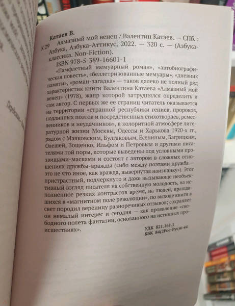 Описание«Памфлетный мемуарный роман», «автобиографическая повесть», «беллетризованные мемуары», «дневник памяти», «роман-загадка» – таков далеко не полный ряд характеристик книги Валентина Катаева «Алмазный мой венец» (1978), жанр которой затруднялся определить и сам автор. С первых же ее страниц читатель оказывается на территории «странной республики гениев, пророков, подлинных поэтов и посредственных стихотворцев, ремесленников и неудачников», в колоритной атмосфере литературной жизни Москвы, Одессы и Харькова 1920-х гг., рядом с Маяковским, Булгаковым, Есениным, Багрицким, Олешей, Зощенко, Ильфом и Петровым и другими писателями той поры, которые выведены под условными прозвищами-масками и состоят с автором в сложных отношениях дружбы-вражды («ибо между поэтами дружба – это не что иное, как вражда, вывернутая наизнанку»). Этот пристрастный, подчеркнуто и даже вызывающе необъективный взгляд писателя на собственную молодость, на исполненное резких контрастов время, на людей, вращавшихся в «магнитном поле революции», по выходе книги в свет породил вереницу разноречивых отзывов; сохраняет он немалый интерес и сегодня – как проявление «свободного полета фантазии, основанного на истинных происшествиях».Свернуть«Памфлетный мемуарный роман», «автобиографическая повесть», «беллетризованные мемуары», «дневник памяти», «роман-загадка» – таков далеко не полный ряд характеристик книги Валентина Катаева «Алмазный мой венец» (1978), жанр которой затруднялся определить и сам автор. С первых же ее страниц читатель оказывается на территории «странной республики гениев, пророков, подлинных поэтов и посредственных стихотворцев, ремесленников и неудачников», в колоритной атмосфере литературной жизни Москвы, Одессы и Харькова 1920-х гг., рядом с Маяковским, Булгаковым, Есениным, Багрицким, Олешей, Зощенко, Ильфом и Петровым и другими писателями той поры, которые выведены под условными прозвищами-масками и состоят с автором в сложных отношениях дружбы-вражды («ибо между поэтами дружба – это не что иное, как вражда, вывернутая наизнанку»). Этот пристрастный, подчеркнуто и даже вызывающе необъективный взгляд писателя на собственную молодость, на исполненное резких контрастов время, на людей, вращавшихся в «магнитном поле революции», по выходе книги в свет породил вереницу разноречивых отзывов; сохраняет он немалый интерес и сегодня – как проявление «свободного полета фантазии, основанного на истинных происшествиях».СвернутьСвернуть