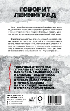 ОписаниеВ книгу русской поэтессы и журналистки Ольги Берггольц вошли ее дневниковые записи, тексты радио-выступлений, относящиеся к тяжелому времени ленинградской блокады, и повесть "Дневные звезды", которую автор считала главной книгой своей жизни. Ольга Берггольц вспоминала: "На улицах Ленинграда люди уже падали с ног от голода... Один район за другим погружался во тьму, подобную полярной ночи, иссякала энергия, уходил из города свет, замирало движение. И сплошь и рядом оказывалось, что у ослабевшего, полумертвого ленинградца существует только одна форма связи с внешним миром, это - "тарелка" радио".В книгу русской поэтессы и журналистки Ольги Берггольц вошли ее дневниковые записи, тексты радио-выступлений, относящиеся к тяжелому времени ленинградской блокады, и повесть "Дневные звезды", которую автор считала главной книгой своей жизни. Ольга Берггольц вспоминала: "На улицах Ленинграда люди уже падали с ног от голода... Один район за другим погружался во тьму, подобную полярной ночи, иссякала энергия, уходил из города свет, замирало движение. И сплошь и рядом оказывалось, что у ослабевшего, полумертвого ленинградца существует только одна форма связи с внешним миром, это - "тарелка" радио".
