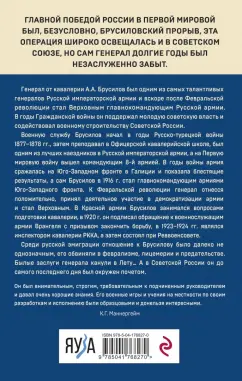 ОписаниеГлавной победой России в Первой мировой был безусловно Брусиловский прорыв, это операция широко освещалась и в Советском Союзе, но сам генерал долгие годы был незаслуженно забыт. Генерал от кавалерии А.А. Брусилов был одним из самых талантливых генералов Русской императорской армии и вскоре после Февральской революции стал Верховным главнокомандующим Русской армии. В годы Гражданской войны он поддержал молодую советскую власть и содействовал военному строительству Советской России. Военную службу Брусилов начал в годы Русско-турецкой войны 1877 — 1878 гг., затем преподавал в Офицерской кавалерийской школе, был одним из лучших наездников в Русской императорской армии, а на Первую мировую войну вышел командующим 8-й армией. В годы войны армия сражалась на Юго-Западном фронте в Галиции и показала блестящие результаты, а сам Брусилов в 1916 г. стал главнокомандующим армиями Юго-Западного фронта. К Февральской революции генерал отнесся положительно и принял деятельное участие в демократизации армии и стал Верховным. В Красной Армии Брусилов занимался вопросами подготовки кавалерии, в 1920 г. он подписал обращение к военнослужащим армии Врангеля с призывом закончить борьбу, в 1923—1924 гг. являлся инспектором кавалерии РККА, а затем состоял при Реввоенсовете. Среди русской эмиграции отношение к Брусилову было далеко не однозначным, его обвиняли в феврализме, лицемерии и предательстве. Былые заслуги генерала канули в Лету… А в Советской России он до самого последнего дня был окружен почетом.СвернутьГлавной победой России в Первой мировой был безусловно Брусиловский прорыв, это операция широко освещалась и в Советском Союзе, но сам генерал долгие годы был незаслуженно забыт. Генерал от кавалерии А.А. Брусилов был одним из самых талантливых генералов Русской императорской армии и вскоре после Февральской революции стал Верховным главнокомандующим Русской армии. В годы Гражданской войны он поддержал молодую советскую власть и содействовал военному строительству Советской России. Военную службу Брусилов начал в годы Русско-турецкой войны 1877 — 1878 гг., затем преподавал в Офицерской кавалерийской школе, был одним из лучших наездников в Русской императорской армии, а на Первую мировую войну вышел командующим 8-й армией. В годы войны армия сражалась на Юго-Западном фронте в Галиции и показала блестящие результаты, а сам Брусилов в 1916 г. стал главнокомандующим армиями Юго-Западного фронта. К Февральской революции генерал отнесся положительно и принял деятельное участие в демократизации армии и стал Верховным. В Красной Армии Брусилов занимался вопросами подготовки кавалерии, в 1920 г. он подписал обращение к военнослужащим армии Врангеля с призывом закончить борьбу, в 1923—1924 гг. являлся инспектором кавалерии РККА, а затем состоял при Реввоенсовете. Среди русской эмиграции отношение к Брусилову было далеко не однозначным, его обвиняли в феврализме, лицемерии и предательстве. Былые заслуги генерала канули в Лету… А в Советской России он до самого последнего дня был окружен почетом.СвернутьСвернуть