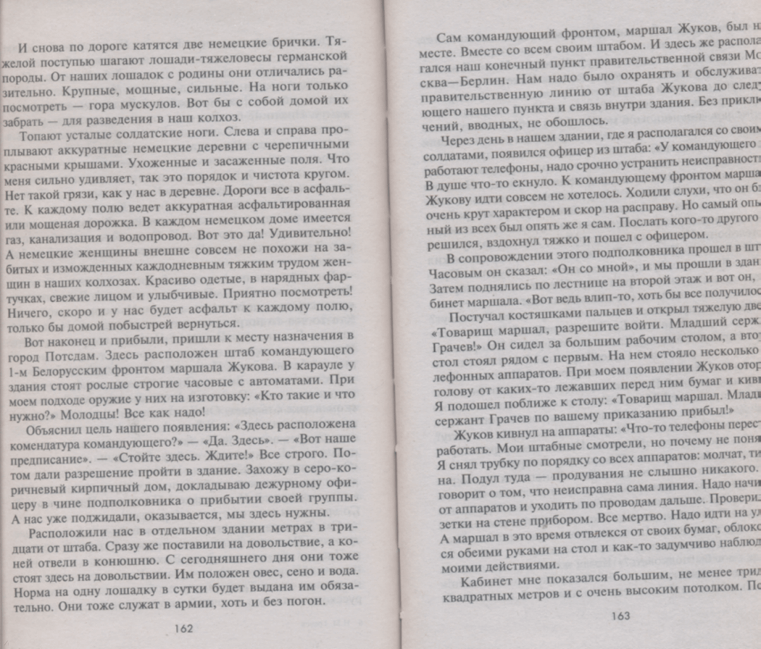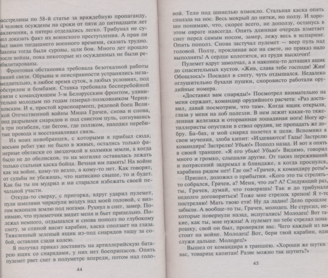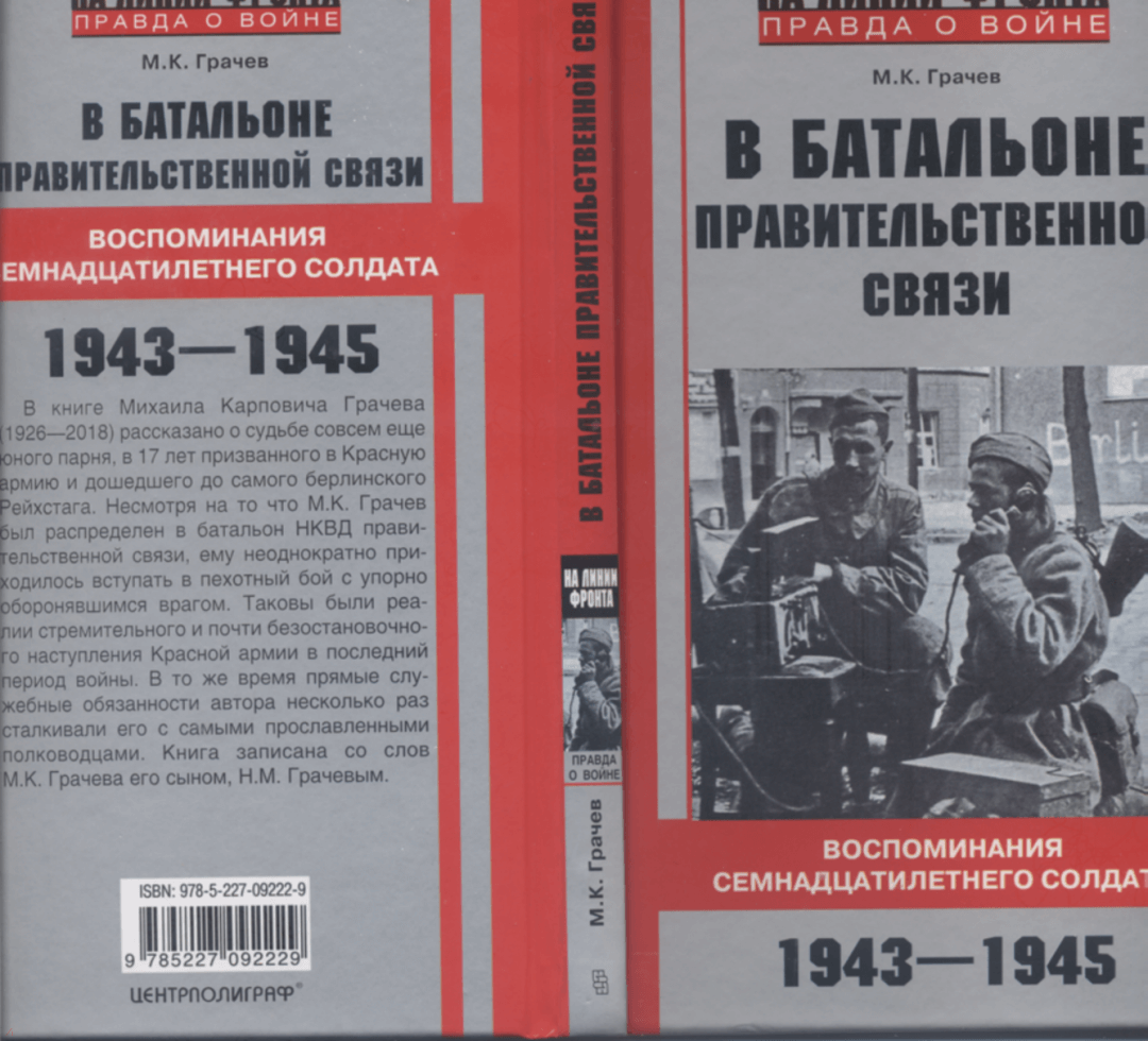ОписаниеВ книге Михаила Карповича Грачева (1926–2018) рассказано о судьбе совсем еще юного парня, в 17 лет призванного в Красную армию и дошедшего до самого берлинского Рейхстага. Несмотря на то что М.К. Грачев был распределен в батальон НКВД правительственной связи, ему неоднократно приходилось вступать в пехотный бой с упорно оборонявшимся врагом. Таковы были реалии стремительного и почти безостановочного наступления Красной армии в последний период войны. В то же время прямые служебные обязанности автора несколько раз сталкивали его с самыми прославленными полководцами. Книга записана со слов М.К. Грачева его сыном Н.М. Грачевым.В книге Михаила Карповича Грачева (1926–2018) рассказано о судьбе совсем еще юного парня, в 17 лет призванного в Красную армию и дошедшего до самого берлинского Рейхстага. Несмотря на то что М.К. Грачев был распределен в батальон НКВД правительственной связи, ему неоднократно приходилось вступать в пехотный бой с упорно оборонявшимся врагом. Таковы были реалии стремительного и почти безостановочного наступления Красной армии в последний период войны. В то же время прямые служебные обязанности автора несколько раз сталкивали его с самыми прославленными полководцами. Книга записана со слов М.К. Грачева его сыном Н.М. Грачевым.