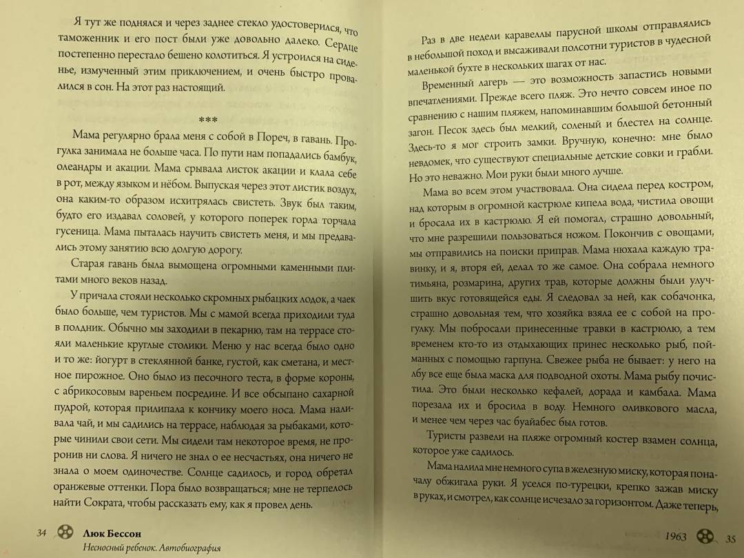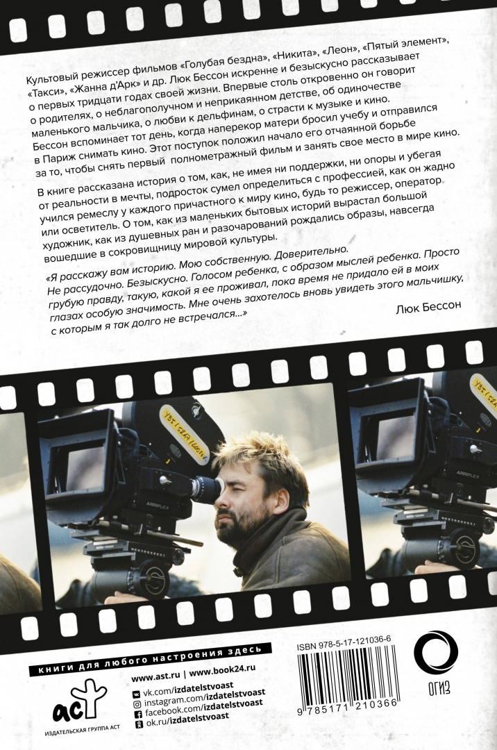 ОписаниеКультовый режиссер фильмов "Голубая бездна", "Никита", "Леон", "Пятый элемент", "Такси", "Жанна д`Арк" и др. Люк Бессон искренне и безыскусно рассказывает о первых тридцати годах своей жизни. Впервые столь откровенно он говорит о родителях, о неблагополучном и неприкаянном детстве, об одиночестве маленького мальчика, о любви к дельфинам, о страсти к музыке и кино.Бессон вспоминает тот день, когда наперекор матери бросил учебу и отправился в Париж снимать кино. Этот поступок положил начало его отчаяннои? борьбе за то, чтобы снять первыи? полнометражныи? фильм и занять свое место в мире кино.В книге рассказана история о том, как, не имея ни поддержки, ни опоры и убегая от реальности в мечты, подросток сумел определиться с профессией, как он жадно учился ремеслу у каждого причастного к миру кино, будь то режиссер, оператор или осветитель. О том, как из маленьких бытовых историй вырастал большой художник, как из душевных ран и разочарований рождались образы, навсегда вошедшие в сокровищницу мировой культуры."Я расскажу вам историю. Мою собственную. Доверительно. Не рассудочно. Безыскусно. Голосом ребенка, с образом мыслей ребенка. Просто грубую правду, такую, какой я ее проживал, пока время не придало ей в моих глазах особую значимость. Мне очень захотелось вновь увидеть этого мальчишку, с которым я так долго не встречался…"Люк БессонСвернутьКультовый режиссер фильмов "Голубая бездна", "Никита", "Леон", "Пятый элемент", "Такси", "Жанна д`Арк" и др. Люк Бессон искренне и безыскусно рассказывает о первых тридцати годах своей жизни. Впервые столь откровенно он говорит о родителях, о неблагополучном и неприкаянном детстве, об одиночестве маленького мальчика, о любви к дельфинам, о страсти к музыке и кино.Бессон вспоминает тот день, когда наперекор матери бросил учебу и отправился в Париж снимать кино. Этот поступок положил начало его отчаяннои? борьбе за то, чтобы снять первыи? полнометражныи? фильм и занять свое место в мире кино.В книге рассказана история о том, как, не имея ни поддержки, ни опоры и убегая от реальности в мечты, подросток сумел определиться с профессией, как он жадно учился ремеслу у каждого причастного к миру кино, будь то режиссер, оператор или осветитель. О том, как из маленьких бытовых историй вырастал большой художник, как из душевных ран и разочарований рождались образы, навсегда вошедшие в сокровищницу мировой культуры."Я расскажу вам историю. Мою собственную. Доверительно. Не рассудочно. Безыскусно. Голосом ребенка, с образом мыслей ребенка. Просто грубую правду, такую, какой я ее проживал, пока время не придало ей в моих глазах особую значимость. Мне очень захотелось вновь увидеть этого мальчишку, с которым я так долго не встречался…"Люк БессонСвернутьСвернуть