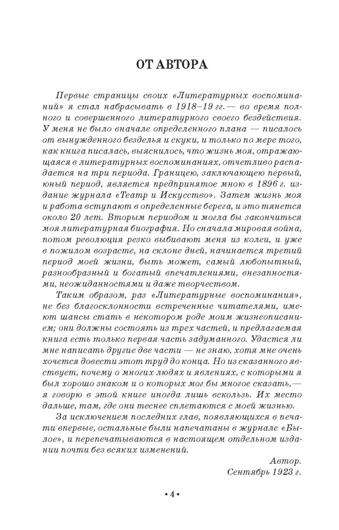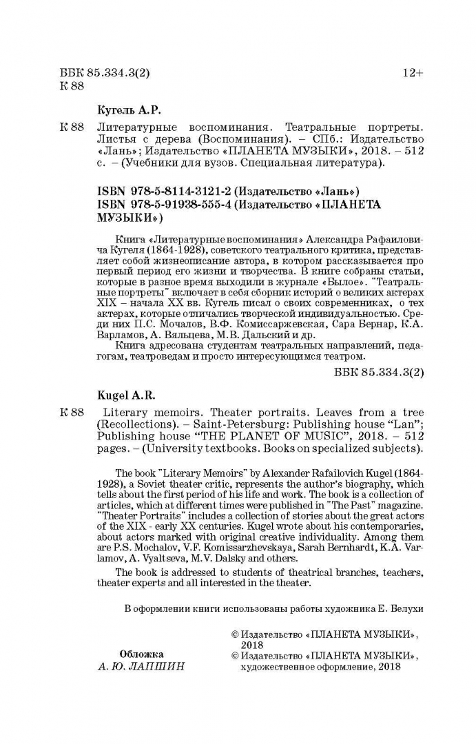 ОписаниеКнига "Литературные воспоминания" Александра Рафаиловича Кугеля (1864-1928), советского театрального критика, представляет собой жизнеописание автора, в котором рассказывается про первый период его жизни и творчества. В книге собраны статьи, которые в разное время выходили в журнале "Былое". "Театральные портреты" включает в себя сборник историй о великих актерах XIX - начала XX вв. Кугель писал о своих современниках, о тех актерах, которые отличались творческой индивидуальностью. Среди них П.С. Мочалов, В.Ф. Комиссаржевская, Сара Бернар, К.А. Варламов, А. Вяльцева, М.В. Дальский и др.Книга адресована студентам театральных направлений, педагогам, театроведам и просто интересующимся театром.Книга "Литературные воспоминания" Александра Рафаиловича Кугеля (1864-1928), советского театрального критика, представляет собой жизнеописание автора, в котором рассказывается про первый период его жизни и творчества. В книге собраны статьи, которые в разное время выходили в журнале "Былое". "Театральные портреты" включает в себя сборник историй о великих актерах XIX - начала XX вв. Кугель писал о своих современниках, о тех актерах, которые отличались творческой индивидуальностью. Среди них П.С. Мочалов, В.Ф. Комиссаржевская, Сара Бернар, К.А. Варламов, А. Вяльцева, М.В. Дальский и др.Книга адресована студентам театральных направлений, педагогам, театроведам и просто интересующимся театром.