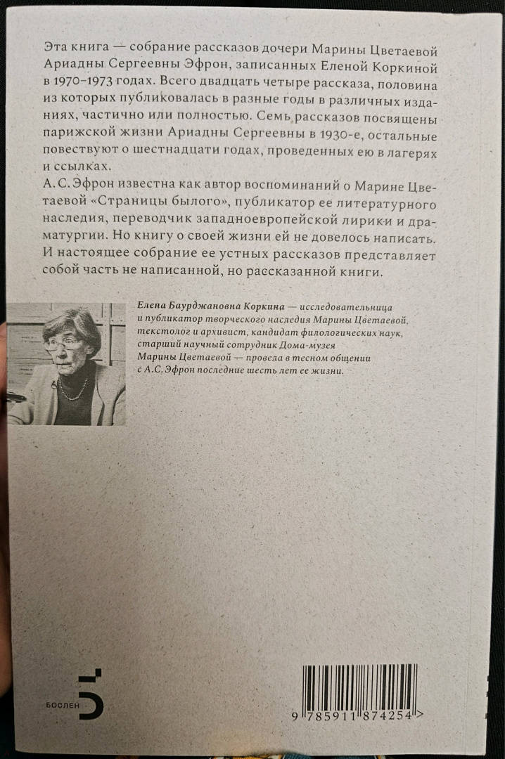 ОписаниеЭта книга - собрание рассказов дочери Марины Цветаевой Ариадны Сергеевны Эфрон, записанных Еленой Коркиной в 1970-1973 годах. Всего двадцать четыре рассказа, семь из которых посвящены парижской жизни Ариадны Эфрон в 1930-е, остальные повествуют о шестнадцати годах, проведенных ею в лагерях и ссылках. А. С. Эфрон известна как автор воспоминаний о Марине Цветаевой "Страницы былого", публикатор ее литературного наследия, переводчик западноевропейской лирики и драматургии. Но книгу о своей жизни ей не довелось написать. И настоящее собрание ее устных рассказов представляет собой часть не написанной, но рассказанной книги. Автор - исследовательница и публикатор творческого наследия Марины Цветаевой, текстолог и архивист, кандидат филологических наук, старший научный сотрудник Дома-музея Марины Цветаевой - провела в тесном общении с А. С. Эфрон последние шесть лет ее жизни.Эта книга - собрание рассказов дочери Марины Цветаевой Ариадны Сергеевны Эфрон, записанных Еленой Коркиной в 1970-1973 годах. Всего двадцать четыре рассказа, семь из которых посвящены парижской жизни Ариадны Эфрон в 1930-е, остальные повествуют о шестнадцати годах, проведенных ею в лагерях и ссылках. А. С. Эфрон известна как автор воспоминаний о Марине Цветаевой "Страницы былого", публикатор ее литературного наследия, переводчик западноевропейской лирики и драматургии. Но книгу о своей жизни ей не довелось написать. И настоящее собрание ее устных рассказов представляет собой часть не написанной, но рассказанной книги. Автор - исследовательница и публикатор творческого наследия Марины Цветаевой, текстолог и архивист, кандидат филологических наук, старший научный сотрудник Дома-музея Марины Цветаевой - провела в тесном общении с А. С. Эфрон последние шесть лет ее жизни.