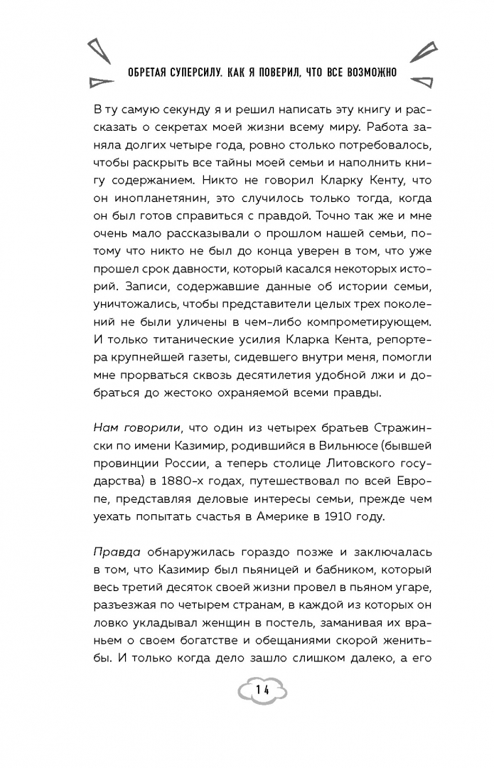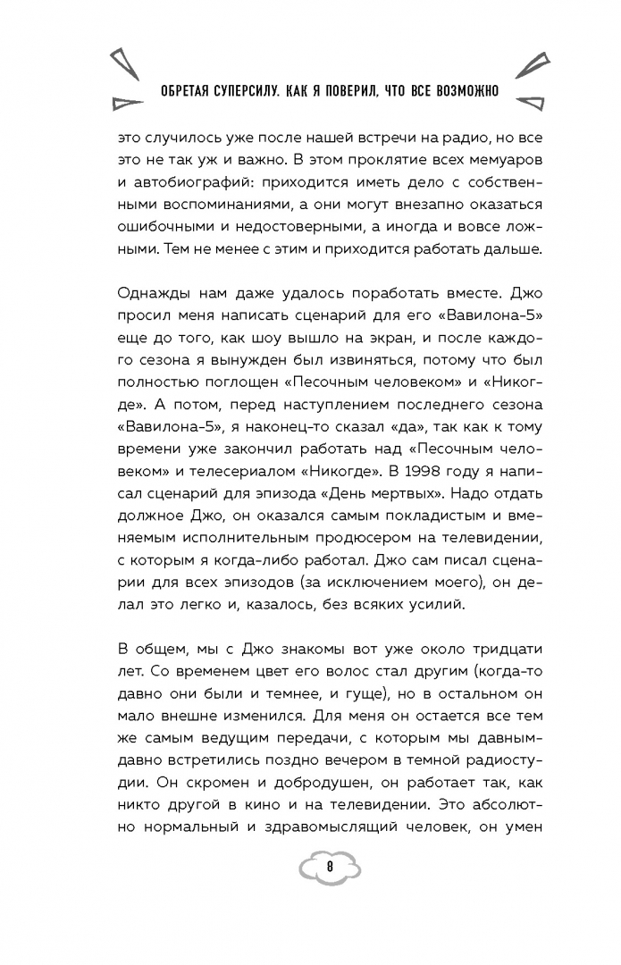 Описание"Если история моей жизни и интересна, то разве что тем, что она доказывает существование возможности выбрать собственный путь, разорвать порочный круг насилия, абьюза и сомнений, и ясно показывает, что можно бороться и победить".Джозеф Майкл Стражински известен нам, прежде всего, как один из самых успешных сценаристов-фантастов. Он автор фильмов "Тор", "Другой мир: пробуждение" и, конечно, популярнейший сериал "Вавилон-5". Но есть история, которую он никогда прежде не рассказывал: его собственная. В автобиографии Стражински рассказывает о своем детстве, которое он провел в крайней нищете. Отец был жестким и пьющим человеком, а мать то и дело оказывалась в психиатрических клиниках. Убежище от ужасов реальности молодой Джо нашел в любимых комиксах. Читая об удивительных мирах и супергероях, он понял, что и у него есть своя суперсила – рассказывать истории, от которых невозможно оторваться. Но даже добившись успеха, Стражински много лет не мог избавиться от темной и шокирующей тайны его семьи. Это история созидания и тьмы, надежды и успеха, невероятного злодея и маленького мальчика, который стал героем своей жизни. И, конечно, захватывающий закулисный взгляд на создание любимых фильмов и сериалов.Свернуть"Если история моей жизни и интересна, то разве что тем, что она доказывает существование возможности выбрать собственный путь, разорвать порочный круг насилия, абьюза и сомнений, и ясно показывает, что можно бороться и победить".Джозеф Майкл Стражински известен нам, прежде всего, как один из самых успешных сценаристов-фантастов. Он автор фильмов "Тор", "Другой мир: пробуждение" и, конечно, популярнейший сериал "Вавилон-5". Но есть история, которую он никогда прежде не рассказывал: его собственная. В автобиографии Стражински рассказывает о своем детстве, которое он провел в крайней нищете. Отец был жестким и пьющим человеком, а мать то и дело оказывалась в психиатрических клиниках. Убежище от ужасов реальности молодой Джо нашел в любимых комиксах. Читая об удивительных мирах и супергероях, он понял, что и у него есть своя суперсила – рассказывать истории, от которых невозможно оторваться. Но даже добившись успеха, Стражински много лет не мог избавиться от темной и шокирующей тайны его семьи. Это история созидания и тьмы, надежды и успеха, невероятного злодея и маленького мальчика, который стал героем своей жизни. И, конечно, захватывающий закулисный взгляд на создание любимых фильмов и сериалов.СвернутьСвернуть