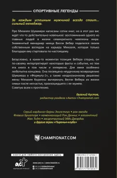 ОписаниеЗа каждым успешным мужчиной всегда стоит... сильный менеджер. Два десятилетия Вилли Вебер занимался делами, пожалуй, самого знаменитого гонщика в мире — Михаэля Шумахера. Вилли Вебер в своей жизни перепробовал множество занятий: чистил картошку в подвале замка, возил африканского дипломата, продавал часы и алкоголь и даже превратился в ресторатора. Но главной страстью в его жизни были автомобили: он торговал ими, гонялся на них, и в итоге они привели его в «Формулу-1».Серый кардинал Берни Экклстоун, рок-звезда «Ф-1» Флавио Бриаторе, каменнолицый Рон Деннис, элегантный Жан Тодт, эксцентричный Эдди Джордан — «королева автоспорта» той поры напоминала настоящий аквариум с пираньями. Со временем Вилли Вебер ощутил себя в нем как рыба в воде и теперь делится забавными байками из паддока. Вы узнаете, как он познакомился с юным Шумахером, тайну перехода Михаэля из Jordan в Benneton и почему он предпочел Ferrari команде McLaren; а также увидите в действии пару хитрых менеджерских приемчиков.Вилли Вебер – менеджер самого титулованного автогонщика современности Михаэля Шумахера. Его автобиография – вдохновляющий, но тернистый путь человека к мечте. Вспоминая события своей жизни и давая им честную оценку, Вилли Вебер раскрывает свое истинное лицо, скрытое под маской успешного менеджера. Книга обнажает «теневую сторону» мира гонок и полна подробностей из жизни и профессиональной карьеры Шумахера. Впервые поклонники автоспорта узнают подлинную историю самого успешного дуэта в мире «Формулы-1» – парнишки из Керпена и ресторатора из Регенсбурга.