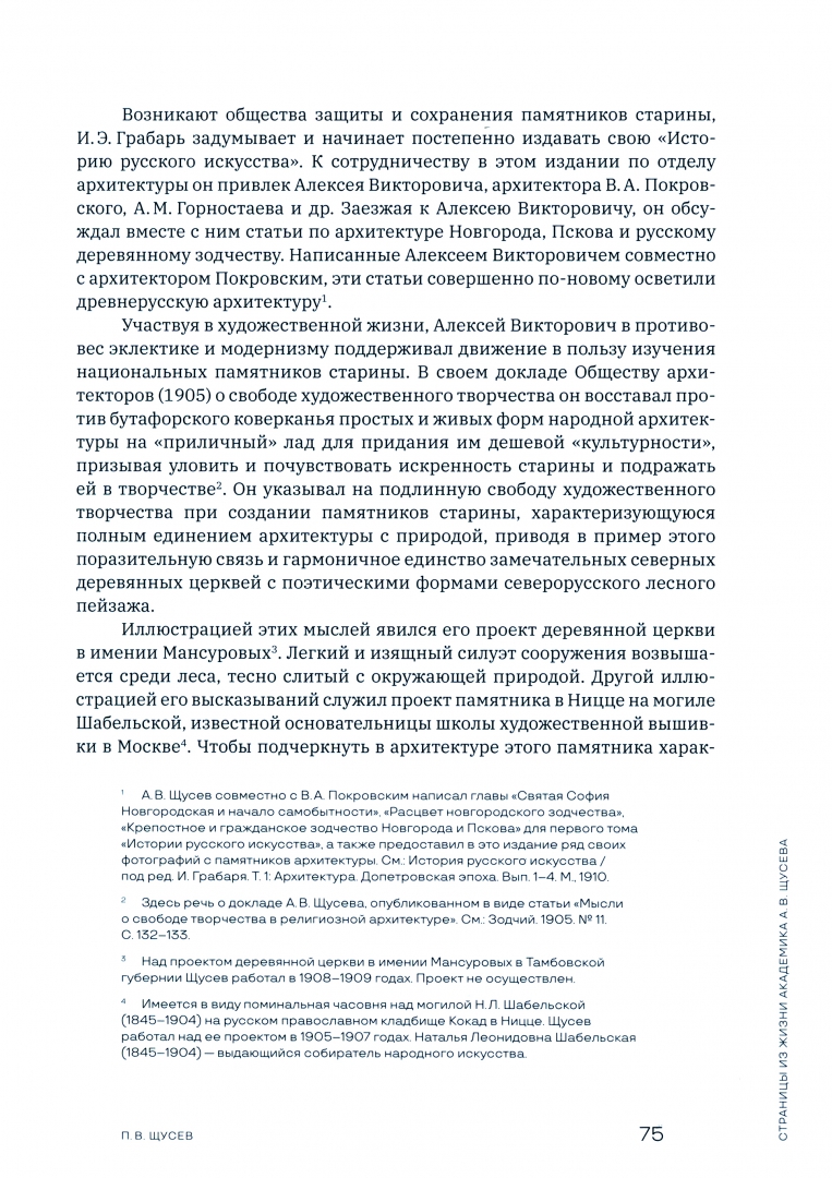 ОписаниеЖизнь и творчество великого русского архитектора Алексея Викторовича Щусева (1873-1949) закономерно притягивают к себе внимание историков и читателей, интересующихся художественной жизнью России первой половины XX века. До революции Щусев - выдающийся зодчий русского модерна, который работал в таких направлениях, как неорусский стиль и неоклассицизм, а также новатор и вдохновитель целого поколения молодых специалистов. После 1970-го он - один из крупнейших представителей авангарда, создавший ряд знаковых сооружений, в числе которых Мавзолей В.И. Ленина - символ целой эпохи. В 1930-е годы на волне входящего в моду во всем мире ар-деко Щусев успешно создавал проекты в советской интерпретации стиля, часто называемый сталинским ампиром. Настоящий сборник отражает взгляд современников на творчество и личность Щусева. В него вошли воспоминания об Алексее Викторовиче, в основном представленные в хронологическом порядке. Так, первое из них, принадлежащее перу брата архитектора, несмотря на полноту охвата творческой деятельности, наиболее глубоко и достоверно рассказывает о его детстве и юности. В свою очередь, воспоминания А.М. Нечаева, ранее не публиковавшиеся, повествуют в большей степени о работе с зодчим до революции и примечательны характеристикой творческого метода Щусева, профессиональных взаимоотношений с художниками. Воспоминания П.И. Нерадовского, коллеги и единомышленника Щусева, интересно освящают отдельные эпизоды 1900-1910-х годов, а также немного касаются советского периода. Завершают сборник мемуары И.А. Синевой - свидетельницы непростых событий 1930-х - начала 1940-х годов.Каждый текст воспоминаний снабжен биографическим очерком, рассказывающим об авторе и обстоятельствах написания мемуаров. Издание включает проектные чертежи, художественную графику, архивные фотографии и документы.СвернутьЖизнь и творчество великого русского архитектора Алексея Викторовича Щусева (1873-1949) закономерно притягивают к себе внимание историков и читателей, интересующихся художественной жизнью России первой половины XX века. До революции Щусев - выдающийся зодчий русского модерна, который работал в таких направлениях, как неорусский стиль и неоклассицизм, а также новатор и вдохновитель целого поколения молодых специалистов. После 1970-го он - один из крупнейших представителей авангарда, создавший ряд знаковых сооружений, в числе которых Мавзолей В.И. Ленина - символ целой эпохи. В 1930-е годы на волне входящего в моду во всем мире ар-деко Щусев успешно создавал проекты в советской интерпретации стиля, часто называемый сталинским ампиром. Настоящий сборник отражает взгляд современников на творчество и личность Щусева. В него вошли воспоминания об Алексее Викторовиче, в основном представленные в хронологическом порядке. Так, первое из них, принадлежащее перу брата архитектора, несмотря на полноту охвата творческой деятельности, наиболее глубоко и достоверно рассказывает о его детстве и юности. В свою очередь, воспоминания А.М. Нечаева, ранее не публиковавшиеся, повествуют в большей степени о работе с зодчим до революции и примечательны характеристикой творческого метода Щусева, профессиональных взаимоотношений с художниками. Воспоминания П.И. Нерадовского, коллеги и единомышленника Щусева, интересно освящают отдельные эпизоды 1900-
