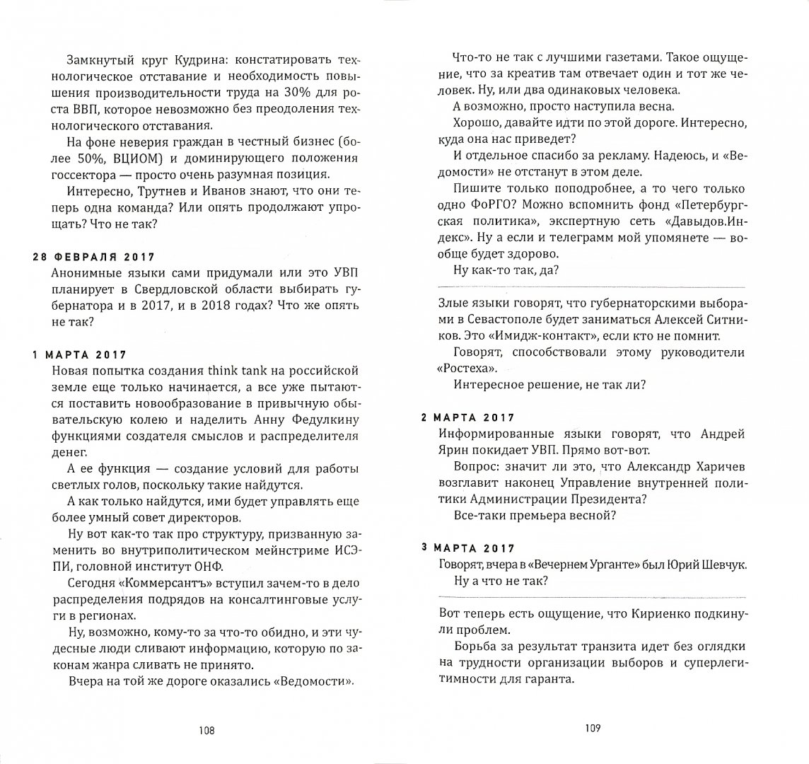 ОписаниеВ книгу известного российского политического консультанта Леонида Давыдова включены посты (сообщения), опубликованные на "Давыдов.Индекс" с ноября 2016 по ноябрь 2017 года.За время работы "Давыдов.Индекс" зарекомендовал себя как независимая высокорепутационная площадка, отличающаяся высоким качеством размещаемой информации.Авторитет "Давыдов.Индекс" подтверждают независимые рейтинги прессы, составляемые компаниями "Медиалогия" и Brand Analitics, по итогом которых он неизменно оказывается в топ-3 российских общественно-политических каналов.Это первый опыт издания информации такого рода. Посты следуют в хронологическом порядке.В книгу известного российского политического консультанта Леонида Давыдова включены посты (сообщения), опубликованные на "Давыдов.Индекс" с ноября 2016 по ноябрь 2017 года.За время работы "Давыдов.Индекс" зарекомендовал себя как независимая высокорепутационная площадка, отличающаяся высоким качеством размещаемой информации.Авторитет "Давыдов.Индекс" подтверждают независимые рейтинги прессы, составляемые компаниями "Медиалогия" и Brand Analitics, по итогом которых он неизменно оказывается в топ-3 российских общественно-политических каналов.Это первый опыт издания информации такого рода. Посты следуют в хронологическом порядке.