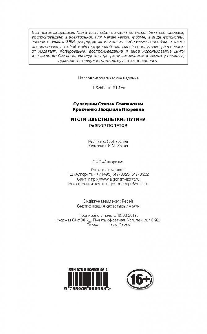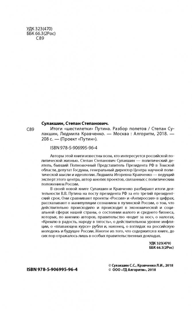 ОписаниеАвторы этой книги известны всем, кто интересуется российской политической жизнью. Степан Степанович Сулакшин - политический деятель, бывший Полномочный Представитель Президента РФ в Томской области, депутат Госдумы, генеральный директор Центра научной политической мысли и идеологии. Людмила Игоревна Кравченко - ведущий эксперт этого центра, автор многих проектов, связанных с политическим положением России.В своей новой книге Сулакшин и Кравченко разбирают итоги деятельности В.В. Путина на посту президента РФ за его третий президентский срок. Они сравнивают проекты "Россия" и "Антироссия" в цифрах, рассказывают о манипуляции сознанием в путинской России, о том, что действительно происходило и происходит в экономической и социальной сферах нашей страны, о состоянии малого и среднего бизнеса, которых, по мнению авторов, правительство "водит за нос", о налогах, "Кремлю в радость, народу в тягость", о действительном уровне инфляции, о "плавающем курсе" рубля и, наконец, о взглядах на российскую молодежь и будущее России. Многое из того, что содержится в книге, до сих пор отражалось лишь в особых правительственных докладах.СвернутьАвторы этой книги известны всем, кто интересуется российской политической жизнью. Степан Степанович Сулакшин - политический деятель, бывший Полномочный Представитель Президента РФ в Томской области, депутат Госдумы, генеральный директор Центра научной политической мысли и идеологии. Людмила Игоревна Кравченко - ведущий эксперт этого центра, автор многих проектов, связанных с политическим положением России.В своей новой книге Сулакшин и Кравченко разбирают итоги деятельности В.В. Путина на посту президента РФ за его третий президентский срок. Они сравнивают проекты "Россия" и "Антироссия" в цифрах, рассказывают о манипуляции сознанием в путинской России, о том, что действительно происходило и происходит в экономической и социальной сферах нашей страны, о состоянии малого и среднего бизнеса, которых, по мнению авторов, правительство "водит за нос", о налогах, "Кремлю в радость, народу в тягость", о действительном уровне инфляции, о "плавающем курсе" рубля и, наконец, о взглядах на российскую молодежь и будущее России. Многое из того, что содержится в книге, до сих пор отражалось лишь в особых правительственных докладах.СвернутьСвернуть