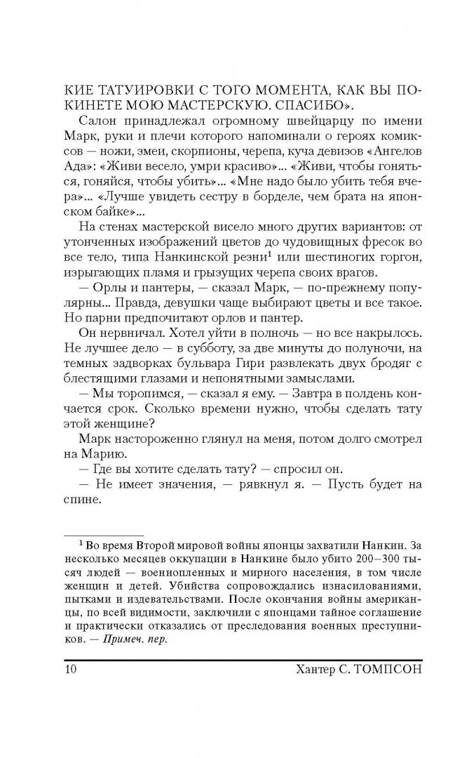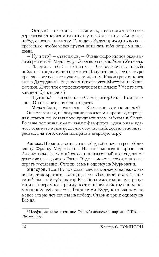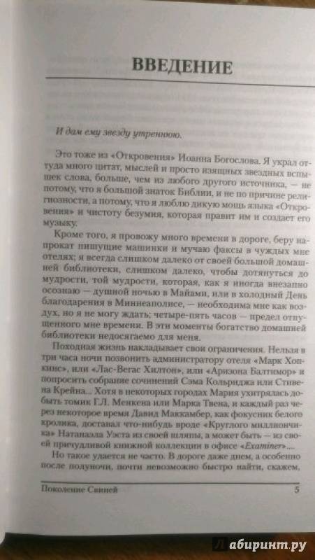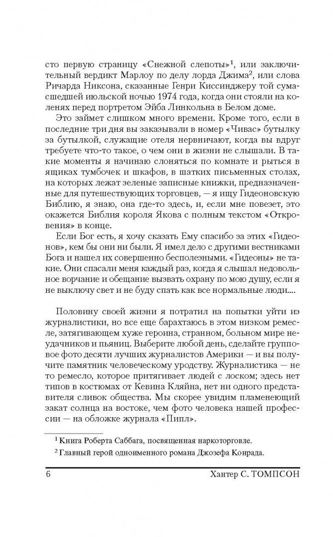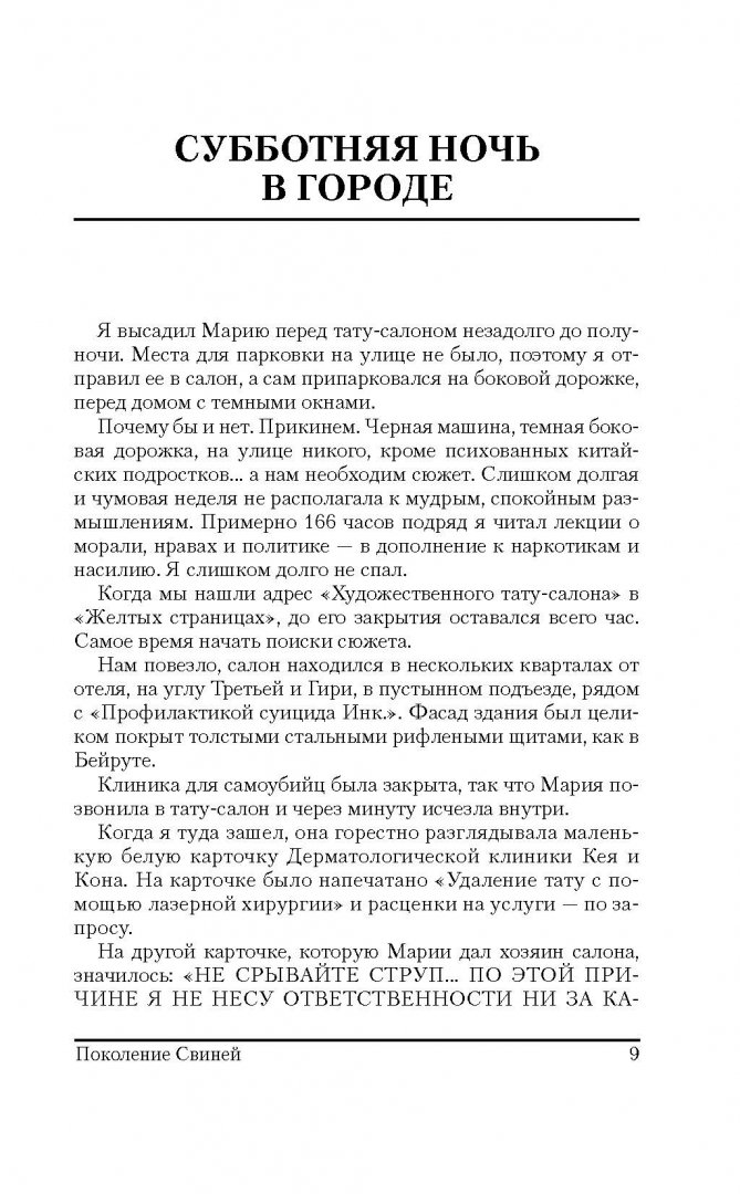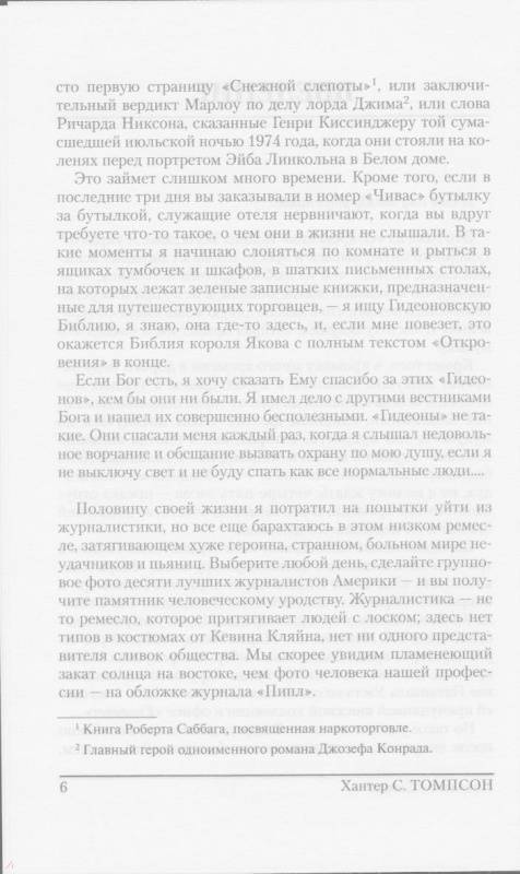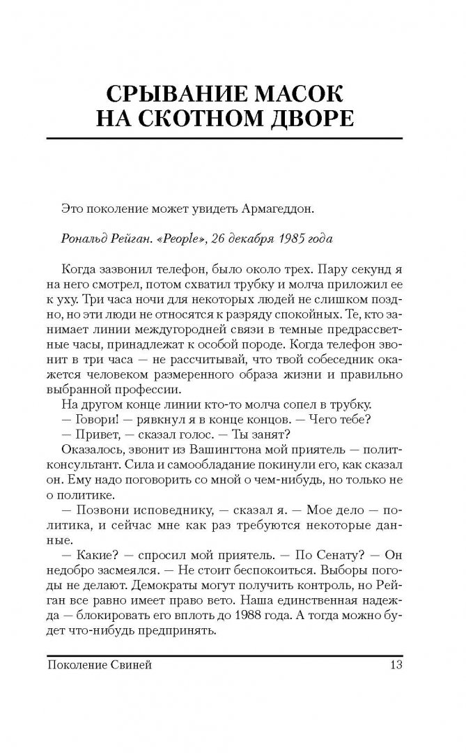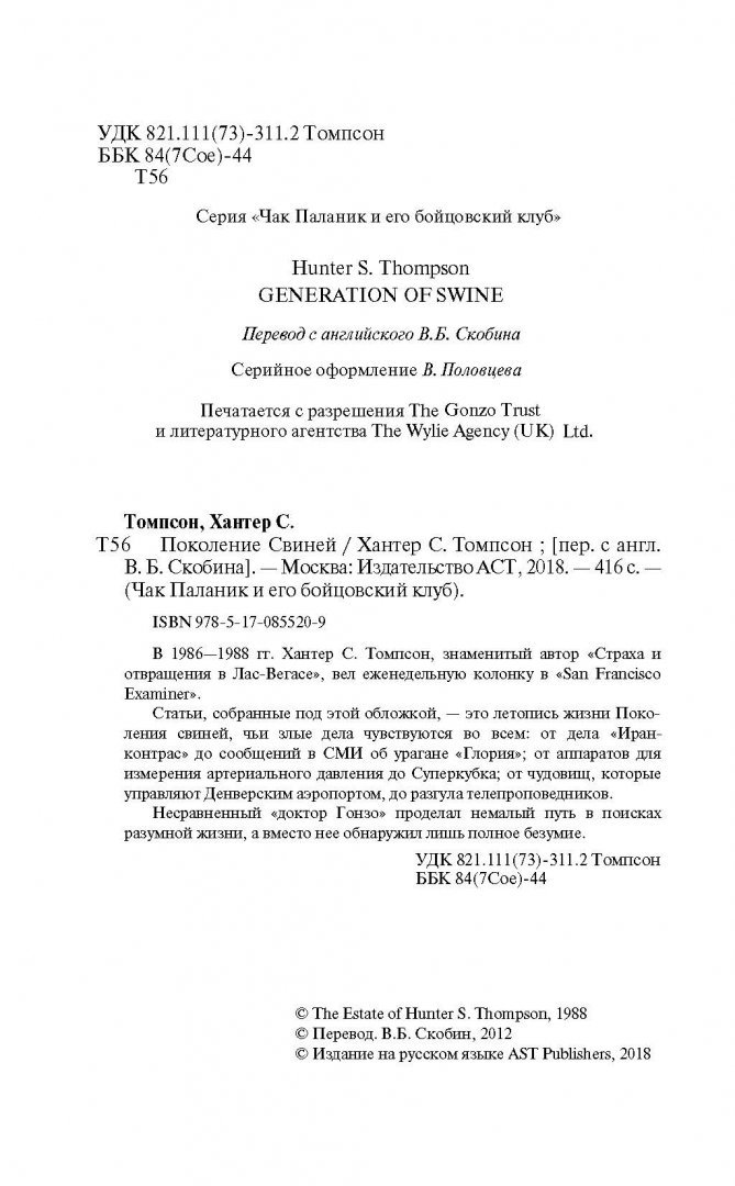 ОписаниеВ 1986-1988 гг. Хантер С. Томпсон, знаменитый автор "Страха и отвращения в Лас-Вегасе", вел еженедельную колонку в "San Francisco Examiner". Статьи, собранные под этой обложкой, - это летопись жизни Поколения свиней, чьи злые дела чувствуются во всем: от дела "Иран-контрас" до сообщения в СМИ об урагане "Глория"; от аппаратов для измерения артериального давления до Суперкубка; от чудовищ, которые управляют Денверским аэропортом, до разгула телепроповедников.Несравненный "доктор Гонзо" проделал немалый путь в поисках разумной жизни, а вместо нее обнаружил лишь полное безумие.В 1986-1988 гг. Хантер С. Томпсон, знаменитый автор "Страха и отвращения в Лас-Вегасе", вел еженедельную колонку в "San Francisco Examiner". Статьи, собранные под этой обложкой, - это летопись жизни Поколения свиней, чьи злые дела чувствуются во всем: от дела "Иран-контрас" до сообщения в СМИ об урагане "Глория"; от аппаратов для измерения артериального давления до Суперкубка; от чудовищ, которые управляют Денверским аэропортом, до разгула телепроповедников.Несравненный "доктор Гонзо" проделал немалый путь в поисках разумной жизни, а вместо нее обнаружил лишь полное безумие.