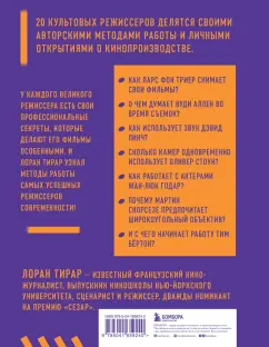 ОписаниеСборник интервью "Профессия режиссер. Частные уроки от великих режиссеров" - уникальная книга! Где еще могут собраться 20 живых классиков современного кино? Даже на премии "Оскар" не всегда бывает такая компания. Лоран Тирар выведал все секреты кинорежиссеров: - Как Ларс фон Триер готовиться к съемкам? - Почему Бернардо Бертолуччи бродит по площадке в одиночестве? - Что самое главное для Дэвида Линча во время работы? - Какой объектив предпочитает Мартин Скорсезе и почему? - Что в голове у Вуди Аллена во время съемочного процесса? Знания, накопленные годами, и хитрости, найденные методом проб и ошибок, собраны в одной книге. Это настоящая выжимка умов и талантов лучших режиссеров современности. "По мне, эти советы - словно вечные истины. Я использую их как чек-лист перед тем, как приняться за следующий фильм, а также как универсальное пособие по исправлению ошибок. Кроме того, я уверенно могу сказать: теперь я не журналист, а режиссер, - и я продолжаю обращаться к этим беседам, потому что меня поражает, сколько всего полезного можно извлечь из беседы с мастером". - Лоран Тирар "Профессия режиссер. Частные уроки от великих режиссеров"СвернутьСборник интервью "Профессия режиссер. Частные уроки от великих режиссеров" - уникальная книга! Где еще могут собраться 20 живых классиков современного кино? Даже на премии "Оскар" не всегда бывает такая компания. Лоран Тирар выведал все секреты кинорежиссеров: - Как Ларс фон Триер готовиться к съемкам? - Почему Бернардо Бертолуччи бродит по площадке в одиночестве? - Что самое главное для Дэвида Линча во время работы? - Какой объектив предпочитает Мартин Скорсезе и почему? - Что в голове у Вуди Аллена во время съемочного процесса? Знания, накопленные годами, и хитрости, найденные методом проб и ошибок, собраны в одной книге. Это настоящая выжимка умов и талантов лучших режиссеров современности. "По мне, эти советы - словно вечные истины. Я использую их как чек-лист перед тем, как приняться за следующий фильм, а также как универсальное пособие по исправлению ошибок. Кроме того, я уверенно могу сказать: теперь я не журналист, а режиссер, - и я продолжаю обращаться к этим беседам, потому что меня поражает, сколько всего полезного можно извлечь из беседы с мастером". - Лоран Тирар "Профессия режиссер. Частные уроки от великих режиссеров"СвернутьСвернуть