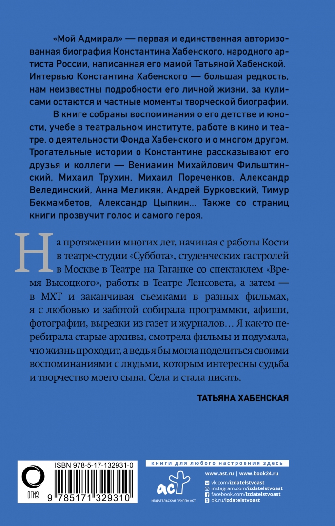 Описание"Мой Адмирал" - первая и единственная авторизованная биография Константина Хабенского, народного артиста России, написанная его мамой Татьяной Хабенской. Интервью Константина Хабенского - большая редкость, нам неизвестны подробности его личной жизни, за кулисами остаются и частные моменты творческой биографии.В книге собраны воспоминания о его детстве и юности, учебе в театральном институте, работе в кино и театре, о деятельности Фонда Хабенского и о многом другом. Трогательные истории о Константине рассказывают его друзья и коллеги - Вениамин Михайлович Фильштинский, Михаил Трухин, Михаил Пореченков, Анна Меликян, Андрей Бурковский, Юрий Башмет, Дмитрий Месхиев, Тимур Бекмамбетов, Александр Цыпкин... Также со страниц книги прозвучит голос и самого героя."Мой Адмирал" - первая и единственная авторизованная биография Константина Хабенского, народного артиста России, написанная его мамой Татьяной Хабенской. Интервью Константина Хабенского - большая редкость, нам неизвестны подробности его личной жизни, за кулисами остаются и частные моменты творческой биографии.В книге собраны воспоминания о его детстве и юности, учебе в театральном институте, работе в кино и театре, о деятельности Фонда Хабенского и о многом другом. Трогательные истории о Константине рассказывают его друзья и коллеги - Вениамин Михайлович Фильштинский, Михаил Трухин, Михаил Пореченков, Анна Меликян, Андрей Бурковский, Юрий Башмет, Дмитрий Месхиев, Тимур Бекмамбетов, Александр Цыпкин... Также со страниц книги прозвучит голос и самого героя.