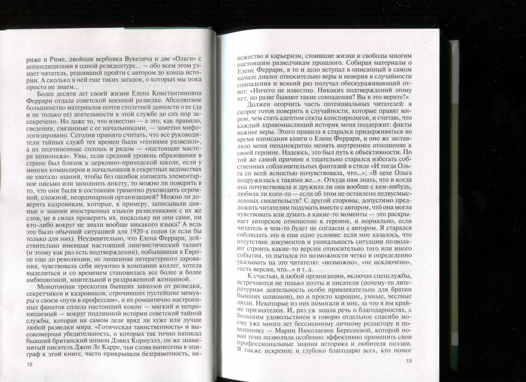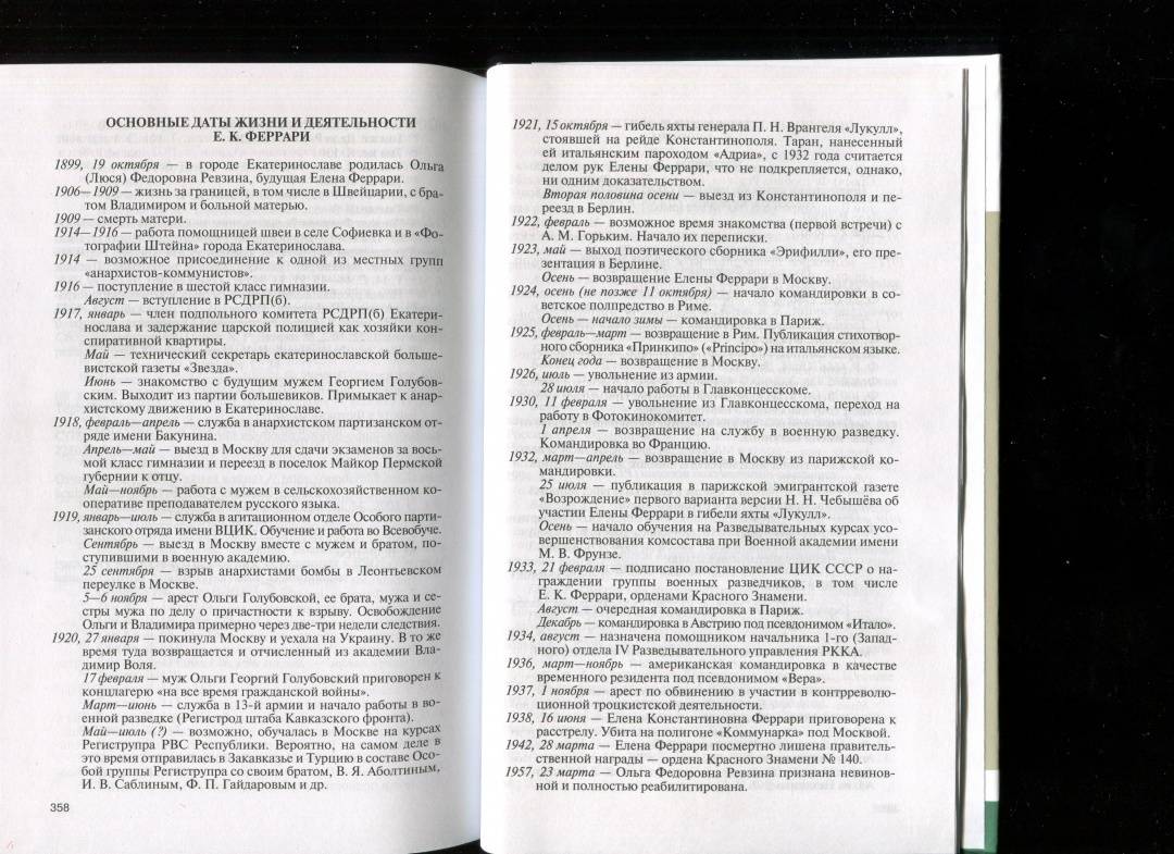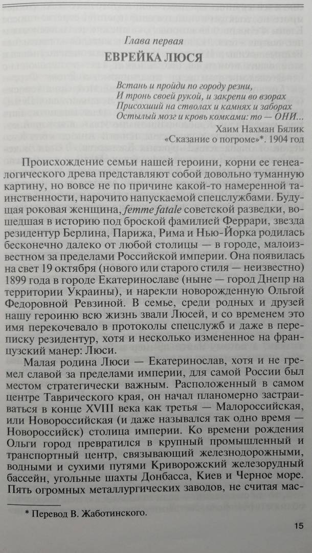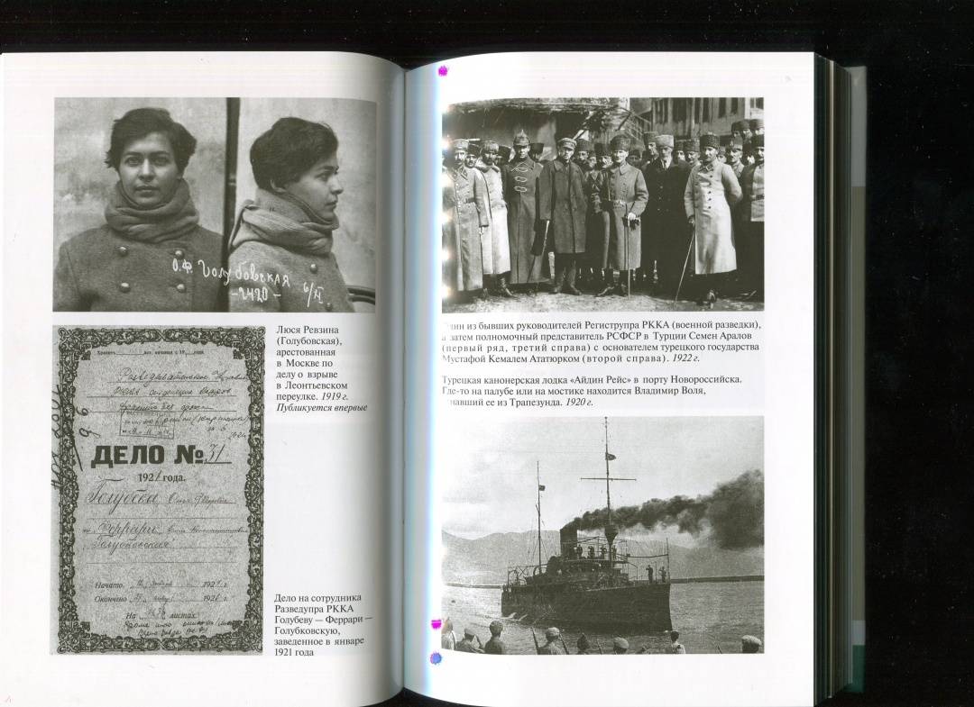 ОписаниеЕе звали Люся Ревзина, Ольга Голубовская, Елена Феррари. Еще имелись оперативные псевдонимы — «Люси», «Ольга», «Ирэн», были, вероятно, и другие. Мы знаем о ней далеко не всё, но и то, что установлено, заставляет задуматься. О том, например, какое отношение имела эта эффектная женщина с библейскими глазами к потоплению в 1921 году яхты генерала Врангеля «Лукулл», с легкостью приписанному на ее счет журналистами. И о ее роли в вербовке агентов для группы Рихарда Зорге в Токио. И о том, кем же она была на самом деле: террористкой, которую арестовывала ЧК еще в 1919-м, «преданным делу партии» агентом разведки или одной из последних поэтесс Серебряного века, дружившей с Горьким? Разочаровалась ли она в своем творчестве или принесла талант в жертву оперативной работе? И, возможно, главное: надо ли искать в ее судьбе подтверждения расхожей фразы «совпадений не бывает» или списать все несчастья на волю злого рока, без подозрений на заговор?..Ее звали Люся Ревзина, Ольга Голубовская, Елена Феррари. Еще имелись оперативные псевдонимы — «Люси», «Ольга», «Ирэн», были, вероятно, и другие. Мы знаем о ней далеко не всё, но и то, что установлено, заставляет задуматься. О том, например, какое отношение имела эта эффектная женщина с библейскими глазами к потоплению в 1921 году яхты генерала Врангеля «Лукулл», с легкостью приписанному на ее счет журналистами. И о ее роли в вербовке агентов для группы Рихарда Зорге в Токио. И о том, кем же она была на самом деле: террористкой, которую арестовывала ЧК еще в 1919-м, «преданным делу партии» агентом разведки или одной из последних поэтесс Серебряного века, дружившей с Горьким? Разочаровалась ли она в своем творчестве или принесла талант в жертву оперативной работе? И, возможно, главное: надо ли искать в ее судьбе подтверждения расхожей фразы «совпадений не бывает» или списать все несчастья на волю злого рока, без подозрений на заговор?..