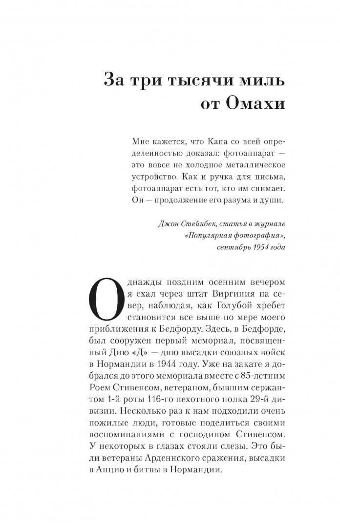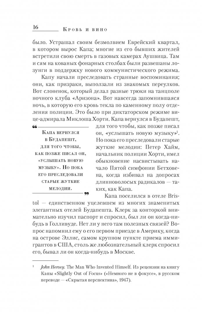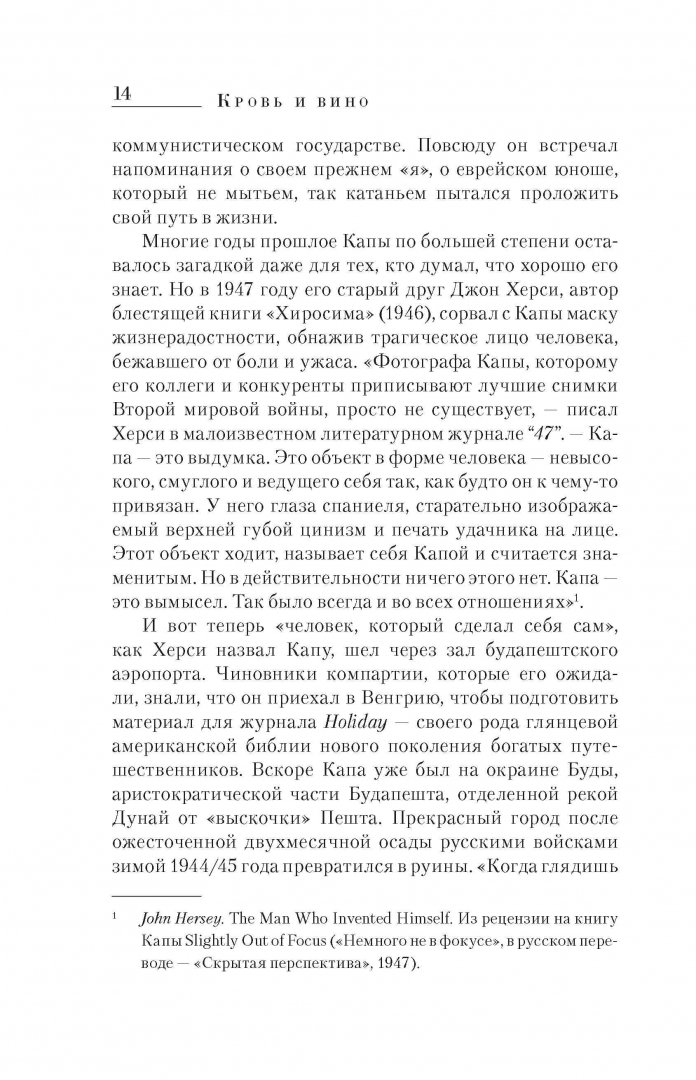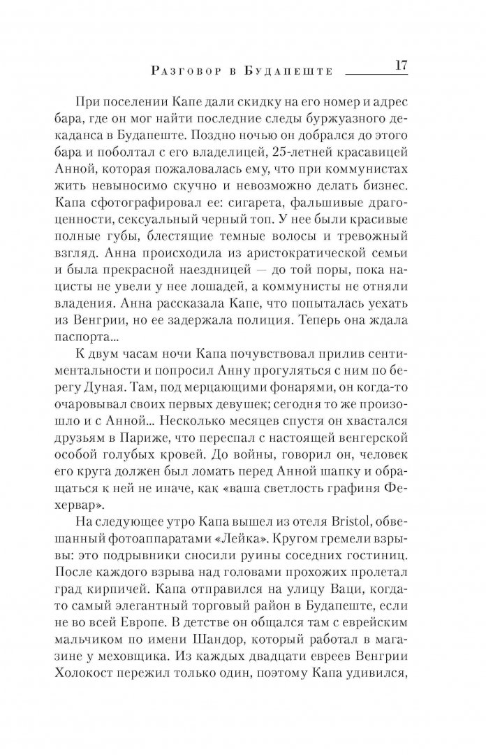 ОписаниеМногие годы прошлое Капы по большей степени оставалось загадкой даже для тех, кто думал, что хорошо его знает. Но в 1947 году его старый друг Джон Херси, автор блестящей книги "Хиросима" (1946), сорвал с Капы маску жизнерадостности, обнажив трагическое лицо человека, бежавшего от боли и ужаса. "Фотографа Капы, которому его коллеги и конкуренты приписывают лучшие снимки Второй мировой войны, просто не существует, - писал Херси в малоизвестном литературном журнале "47". - Капа - это изобретение. Это объект в форме человека - невысокого, смуглого и ведущего себя так, как будто он к чему-то привязан. У него глаза спаниеля, тщательно наведенный цинизм на верхней губе и знак удачи на лице.Книга Кершоу - результат титанической работы автора и созданной им команды. Изучение источников, копание в архивах, поездки по местам событий, а, главное, встречи, беседы и многочисленные многочасовые интервью с людьми, которые знали Капу, - вот фундамент этой книги. Несомненный плюс книги именно в этом - в разноголосице мнений и суждений о человеке. Освещение такими вспышками воспоминаний с разных сторон.СвернутьМногие годы прошлое Капы по большей степени оставалось загадкой даже для тех, кто думал, что хорошо его знает. Но в 1947 году его старый друг Джон Херси, автор блестящей книги "Хиросима" (1946), сорвал с Капы маску жизнерадостности, обнажив трагическое лицо человека, бежавшего от боли и ужаса. "Фотографа Капы, которому его коллеги и конкуренты приписывают лучшие снимки Второй мировой войны, просто не существует, - писал Херси в малоизвестном литературном журнале "47". - Капа - это изобретение. Это объект в форме человека - невысокого, смуглого и ведущего себя так, как будто он к чему-то привязан. У него глаза спаниеля, тщательно наведенный цинизм на верхней губе и знак удачи на лице.Книга Кершоу - результат титанической работы автора и созданной им команды. Изучение источников, копание в архивах, поездки по местам событий, а, главное, встречи, беседы и многочисленные многочасовые интервью с людьми, которые знали Капу, - вот фундамент этой книги. Несомненный плюс книги именно в этом - в разноголосице мнений и суждений о человеке. Освещение такими вспышками воспоминаний с разных сторон.СвернутьСвернуть