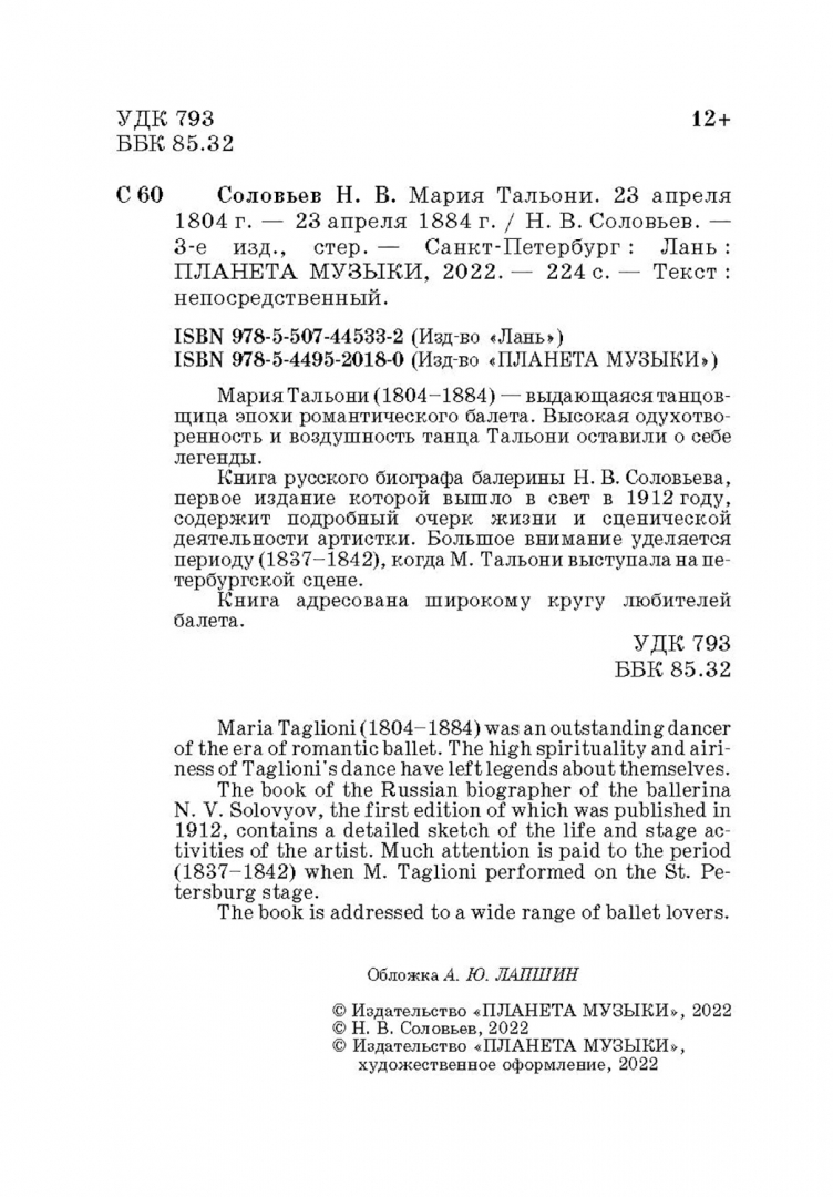 ОписаниеМария Тальони (1804-1884) - выдающаяся танцовщица эпохи романтического балета. Высокая одухотворенность и воздушность танца Тальони оставили о себе легенды. Книга русского биографа балерины Н. В. Соловьева, первое издание которой вышло в свет в 1912 году, содержит подробный очерк жизни и сценической деятельности артистки. Большое внимание уделяется периоду (1837-1842), когда М. Тальони выступала на петербургской сцене. Книга адресована широкому кругу любителей балета.3-е издание, стереотипное.Мария Тальони (1804-1884) - выдающаяся танцовщица эпохи романтического балета. Высокая одухотворенность и воздушность танца Тальони оставили о себе легенды. Книга русского биографа балерины Н. В. Соловьева, первое издание которой вышло в свет в 1912 году, содержит подробный очерк жизни и сценической деятельности артистки. Большое внимание уделяется периоду (1837-1842), когда М. Тальони выступала на петербургской сцене. Книга адресована широкому кругу любителей балета.3-е издание, стереотипное.