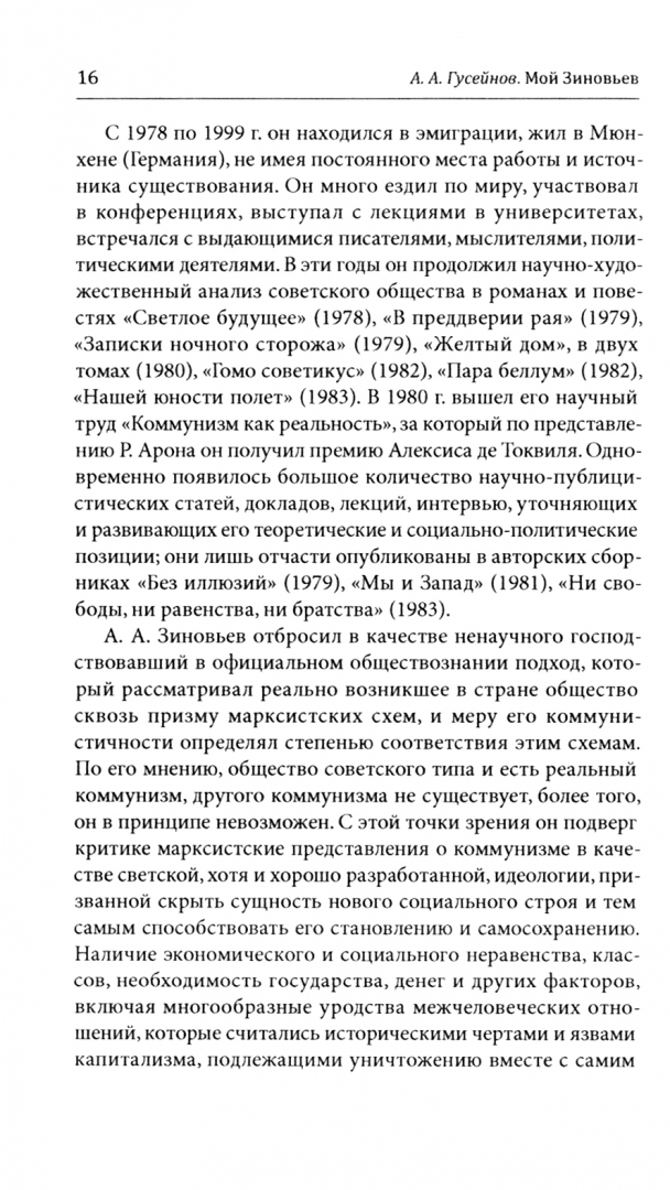 Книга предназначена для широкого круга читателей, является своего рода введением в многогранное творчество Зиновьева, приглашением к чтению его трудов.В сборнике собраны статьи доктора философских наук, академика РАН А. А. Гусейнова, посвященные творчеству и жизненному пути выдающегося русского мыслителя Александра Александровича Зиновьева (1922–2006). Автор видит уникальность Зиновьева в том, что он был на «ты» со своей эпохой — дал научный анализ советского общества как общества реального коммунизма и противопоставил ему свое бунтарское учение о житии. Зиновьев воплотил в своем жизненном опыте зияющие высоты судьбы своего народа на пике его исторического взлета и падения в ХХ веке. Собранные в книге статьи в основном сосредоточены на философско-социологических и этических аспектах мировоззрения мыслителя.