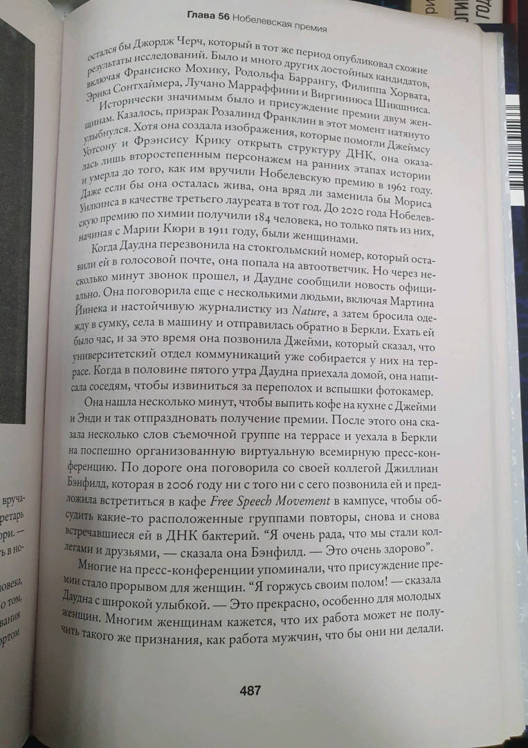 Однако эта книга – не только биография Даудны, но и история развития науки о генетике. Наряду с доступным объяснением того, что именно Даудна и ее коллеги открыли и разработали, в этой книге также рассмотрены и менее обсуждаемые аспекты современной науки: борьба за финансирование, противоречия между целями академических исследований (научный прогресс) и интересами частного сектора (прибыль), трудный процесс публикации и патентования открытий, а также противостояние между учеными.