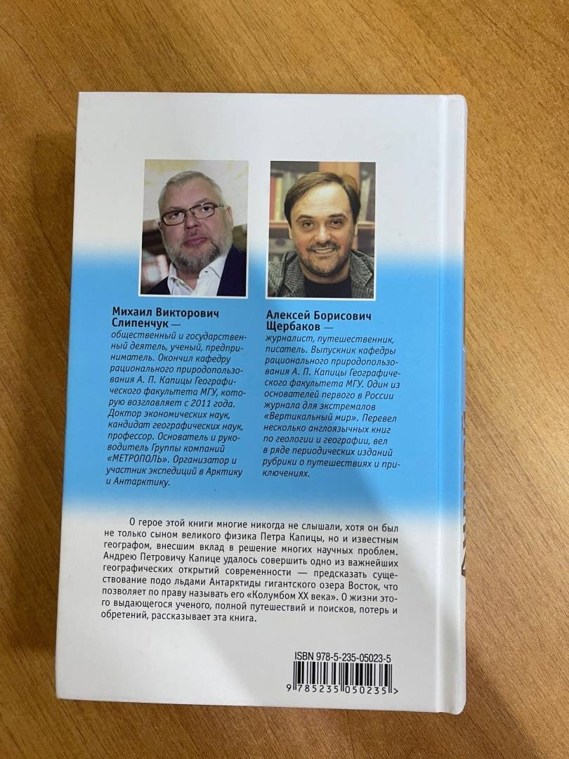 ОписаниеО герое этой книги многие никогда не слышали, хотя он был сыном великого физика Петра Капицы, известным географом, внесшим вклад в решение многих научных проблем. Андрею Петровичу Капице удалось совершить одно из важнейших географических открытий современности - предсказать существование подо льдами Антарктиды гигантского пресноводного озера, что позволяет по праву называть его "Колумбом ХХ века". О жизни этого выдающегося ученого, полной путешествий и поисков, потерь и обретений, рассказывает его первая подробная биография, которую на основе семейного архива А. П. Капицы создали Михаил Слипенчук и Алексей Щербаков.О герое этой книги многие никогда не слышали, хотя он был сыном великого физика Петра Капицы, известным географом, внесшим вклад в решение многих научных проблем. Андрею Петровичу Капице удалось совершить одно из важнейших географических открытий современности - предсказать существование подо льдами Антарктиды гигантского пресноводного озера, что позволяет по праву называть его "Колумбом ХХ века". О жизни этого выдающегося ученого, полной путешествий и поисков, потерь и обретений, рассказывает его первая подробная биография, которую на основе семейного архива А. П. Капицы создали Михаил Слипенчук и Алексей Щербаков.