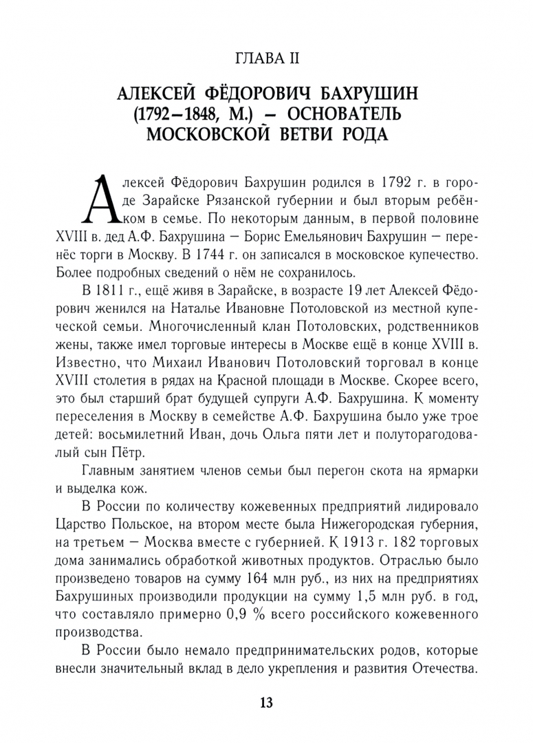 ОписаниеКнига посвящена изучению прогрессивной предпринимательской династии XIX – начала XX в. и приурочена к 200-летию торгово-промышленного дела Бахрушиных и 155-летию со дня рождения самого яркого ее представителя А.А. Бахрушина (1865–1929).Книга представляет собой подробный анализ истории торгово-промышленного рода Бахрушиных в разных аспектах его развития и в длительный хронологический период: более чем за столетие. Поставленная проблема представляется актуальной в связи с бурным ростом предпринимательской активности и деловой инициативы, широким интересом к истокам складывания отечественной бизнес-элиты. В этой книге на большом фактическом, прежде всего архивном, материале доказывается, что торгово-промышленная династия Бахрушиных отличалась от прочих московских предпринимательских семейств специфическими видами деятельности, особой духовностью, образом жизни, бытовым укладом. Книга отличается новизной. Автором впервые вводятся в научный оборот обширные сведения из метрических свидетельств, касающихся рождений, венчаний, а также данных об учебе, из послужных списков многих представителей рода из различных фондов ЦГА Москвы, ОР РГБ, ГИМ и семейных архивов потомков этой семьи.СвернутьКнига посвящена изучению прогрессивной предпринимательской династии XIX – начала XX в. и приурочена к 200-летию торгово-промышленного дела Бахрушиных и 155-летию со дня рождения самого яркого ее представителя А.А. Бахрушина (1865–1929).Книга представляет собой подробный анализ истории торгово-промышленного рода Бахрушиных в разных аспектах его развития и в длительный хронологический период: более чем за столетие. Поставленная проблема представляется актуальной в связи с бурным ростом предпринимательской активности и деловой инициативы, широким интересом к истокам складывания отечественной бизнес-элиты. В этой книге на большом фактическом, прежде всего архивном, материале доказывается, что торгово-промышленная династия Бахрушиных отличалась от прочих московских предпринимательских семейств специфическими видами деятельности, особой духовностью, образом жизни, бытовым укладом. Книга отличается новизной. Автором впервые вводятся в научный оборот обширные сведения из метрических свидетельств, касающихся рождений, венчаний, а также данных об учебе, из послужных списков многих представителей рода из различных фондов ЦГА Москвы, ОР РГБ, ГИМ и семейных архивов потомков этой семьи.СвернутьСвернуть