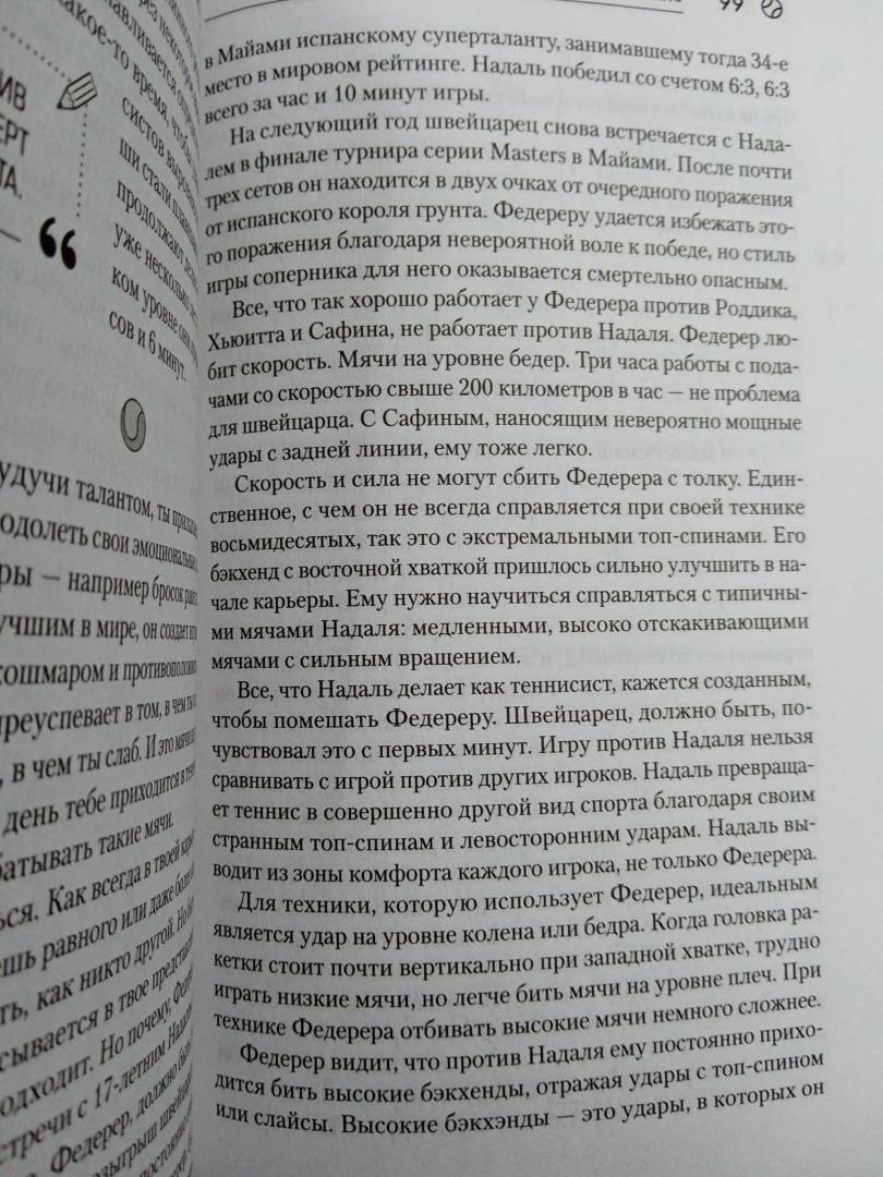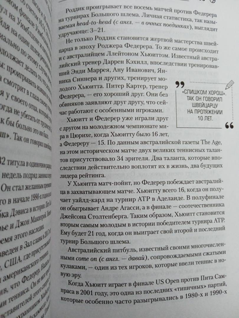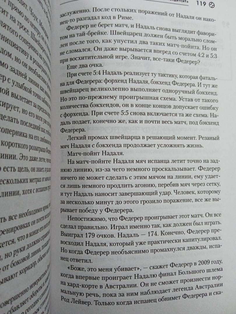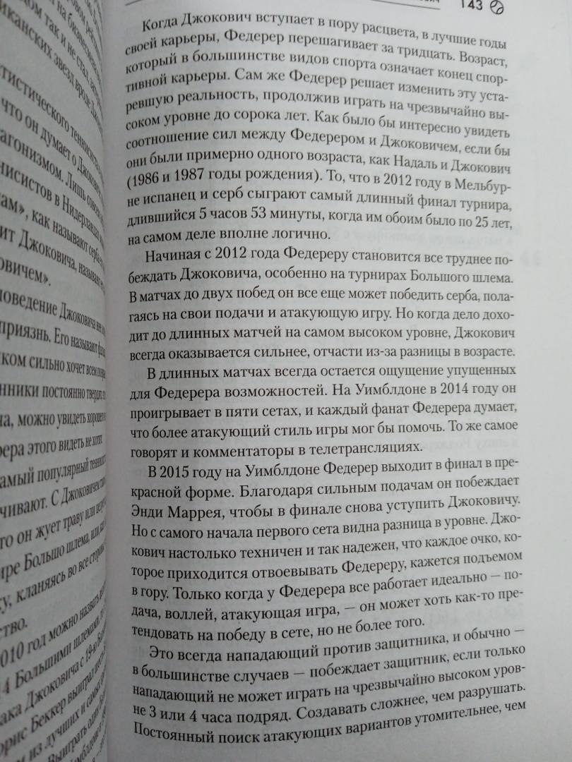 ОписаниеЕго называли Гений, Волшебник, Король, Император, и он вполне заслужил все эти прозвища. Один из величайших игроков в истории тенниса, обладающий неповторимым стилем и фантастической техникой, он искал совершенства везде — и на корте, и вне его. Он сделался иконой стиля, встал в ряд с самыми авторитетными и уважаемыми спортивными деятелями в мире. На его счету 103 выигранных турнира только в одиночном разряде, включая 20 турниров Большого шлема, первый из которых он выиграл в 22 года, победив на Уимблдоне. Шесть раз он побеждал на Итоговом турнире ATP в одиночном разряде и пять раз завершал сезон на первой строчке мирового рейтинга. У него многомиллионная армия фанатов по всему миру. И неудивительно: его матчи порой выглядят как подлинное произведение теннисного искусства. Это все — Роджер Федерер, легенда мирового тенниса. Влюбленный в свой вид спорта, он плакал, завершая карьеру, когда на организованном им же турнире — кубке Лейвера — его от всей души чествовали коллеги-теннисисты.СвернутьЕго называли Гений, Волшебник, Король, Император, и он вполне заслужил все эти прозвища. Один из величайших игроков в истории тенниса, обладающий неповторимым стилем и фантастической техникой, он искал совершенства везде — и на корте, и вне его. Он сделался иконой стиля, встал в ряд с самыми авторитетными и уважаемыми спортивными деятелями в мире. На его счету 103 выигранных турнира только в одиночном разряде, включая 20 турниров Большого шлема, первый из которых он выиграл в 22 года, победив на Уимблдоне. Шесть раз он побеждал на Итоговом турнире ATP в одиночном разряде и пять раз завершал сезон на первой строчке мирового рейтинга. У него многомиллионная армия фанатов по всему миру. И неудивительно: его матчи порой выглядят как подлинное произведение теннисного искусства. Это все — Роджер Федерер, легенда мирового тенниса. Влюбленный в свой вид спорта, он плакал, завершая карьеру, когда на организованном им же турнире — кубке Лейвера — его от всей души чествовали коллеги-теннисисты.СвернутьСвернуть