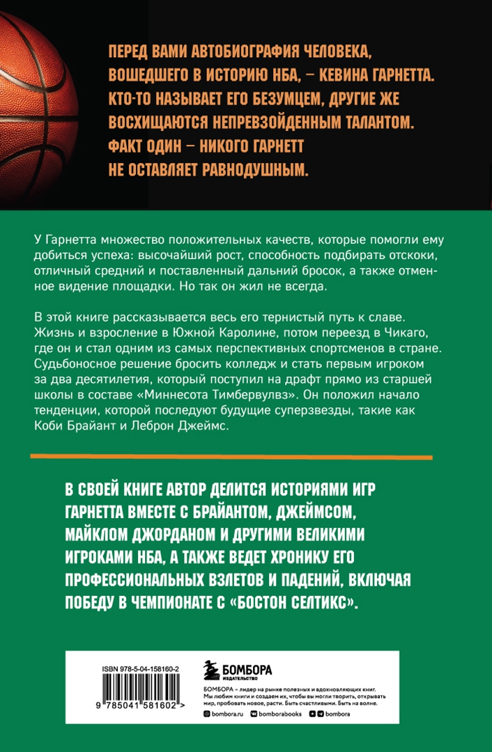 ОписаниеПеред вами биография человека, вошедшего историю НБА - Кевина Гарнетта. Кто-то называет его безумцем, другие же восхищаются непревзойдённым талантом. Факт один - никого Гарнетт не оставляет равнодушным. У Гарнетта множество положительных качеств, которые помогли ему добиться успеха: высочайший рост, способность подбирать отскоки, отличный средний и поставленный дальний бросок, а также отменное видение площадки. Но так он жил не всегда. В этой книге рассказывается весь его тернистый путь к славе. Жизнь и взросление в Южной Каролине, потом переезд в Чикаго, где он и стал одним из самых перспективных спортсменов в стране. Судьбоносное решение бросить колледж и стать первым игроком за два десятилетия, который поступил на драфт прямо из старшей школы в составе "Миннесота Тимбервулвз". Он положил начало тенденции, которой последуют будущие суперзвезды, такие как Коби Брайант и Леброн Джеймс. В своей книге автор делится историями игр Гарнетта вместе с Брайантом, Джеймсом, Майклом Джорданом и другими великими игроками НБА, а также ведет хронику его профессиональных взлетов и падений, включая победу в чемпионате с "Бостон Селтикс".СвернутьПеред вами биография человека, вошедшего историю НБА - Кевина Гарнетта. Кто-то называет его безумцем, другие же восхищаются непревзойдённым талантом. Факт один - никого Гарнетт не оставляет равнодушным. У Гарнетта множество положительных качеств, которые помогли ему добиться успеха: высочайший рост, способность подбирать отскоки, отличный средний и поставленный дальний бросок, а также отменное видение площадки. Но так он жил не всегда. В этой книге рассказывается весь его тернистый путь к славе. Жизнь и взросление в Южной Каролине, потом переезд в Чикаго, где он и стал одним из самых перспективных спортсменов в стране. Судьбоносное решение бросить колледж и стать первым игроком за два десятилетия, который поступил на драфт прямо из старшей школы в составе "Миннесота Тимбервулвз". Он положил начало тенденции, которой последуют будущие суперзвезды, такие как Коби Брайант и Леброн Джеймс. В своей книге автор делится историями игр Гарнетта вместе с Брайантом, Джеймсом, Майклом Джорданом и другими великими игроками НБА, а также ведет хронику его профессиональных взлетов и падений, включая победу в чемпионате с "Бостон Селтикс".СвернутьСвернуть