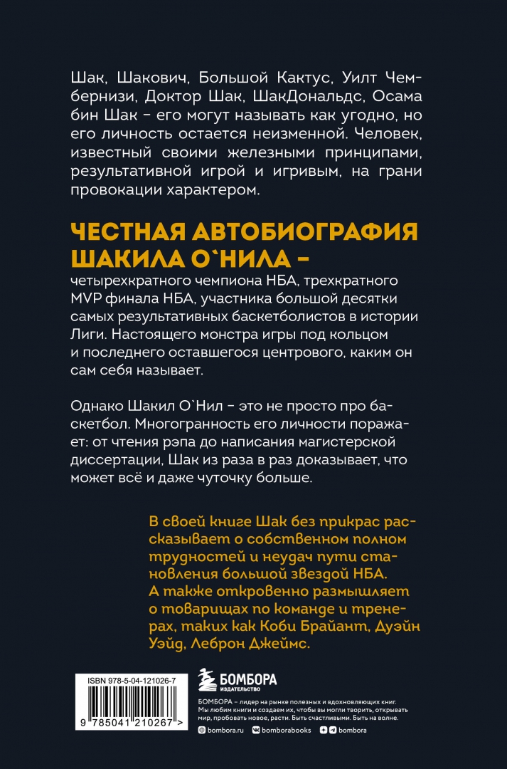 ОписаниеШак, Шакович, Большой Кактус, Уилт Чембернизи, Доктор Шак, ШакДоналдс, Осама бин Шак - его могут называть как угодно, но его личность остается неизменной. Человек, известный своими железными принципами, результативной игрой и игривым, на грани провокации характером. Честная автобиография Шакила О`Нила - четырехкратного чемпиона НБА, трехкратного MVP финала НБА, участника большой десятки самых результативных баскетболистов в истории Лиги. Настоящего монстра игры под кольцом и последнего оставшегося центрового, каким он сам себя называет. Однако Шакил О`Нил - это не просто про баскетбол. Многогранность его личности поражает: от чтения рэпа до написания магистерской диссертации, Шак из раза в раз доказывает, что может всё и даже чуточку больше. В своей книге Шак без прикрас рассказывает о своем пути становления большой звездой НБА, который был полон трудностей и неудач. А также откровенно размышляет о товарищах по команде и тренерах, таких как Коби Брайант, Дуэйн Уэйд, Леброн Джеймс.СвернутьШак, Шакович, Большой Кактус, Уилт Чембернизи, Доктор Шак, ШакДоналдс, Осама бин Шак - его могут называть как угодно, но его личность остается неизменной. Человек, известный своими железными принципами, результативной игрой и игривым, на грани провокации характером. Честная автобиография Шакила О`Нила - четырехкратного чемпиона НБА, трехкратного MVP финала НБА, участника большой десятки самых результативных баскетболистов в истории Лиги. Настоящего монстра игры под кольцом и последнего оставшегося центрового, каким он сам себя называет. Однако Шакил О`Нил - это не просто про баскетбол. Многогранность его личности поражает: от чтения рэпа до написания магистерской диссертации, Шак из раза в раз доказывает, что может всё и даже чуточку больше. В своей книге Шак без прикрас рассказывает о своем пути становления большой звездой НБА, который был полон трудностей и неудач. А также откровенно размышляет о товарищах по команде и тренерах, таких как Коби Брайант, Дуэйн Уэйд, Леброн Джеймс.СвернутьСвернуть