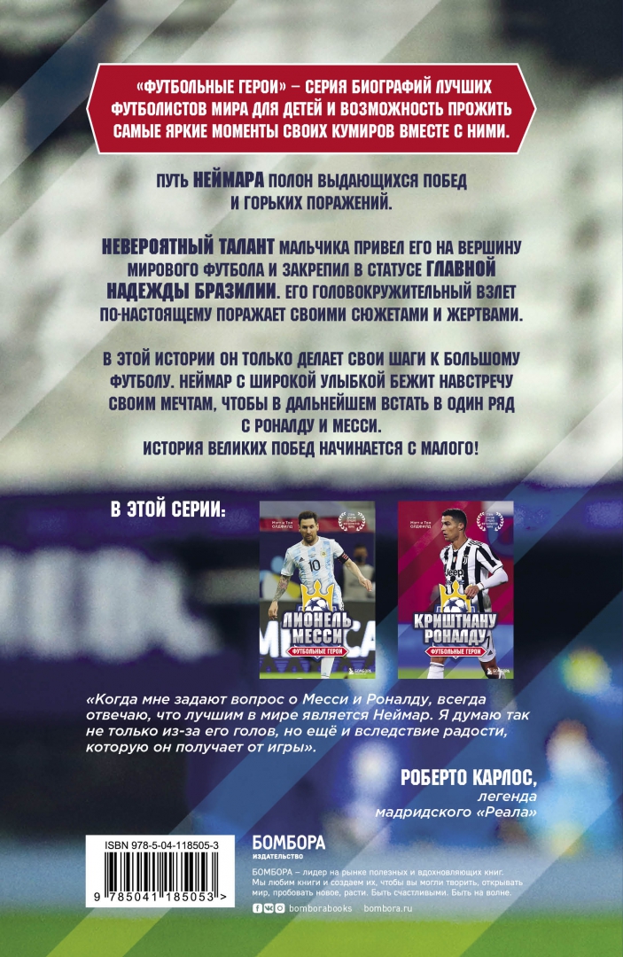ОписаниеПуть Неймара полон выдающихся побед и печальных поражений. Проследим за этапами головокружительного взлета мальчика из Бразилии и его превращения в звездного игрока национальной сборной. В этой истории он только делает свои шаги к феноменальным достижениям в большом футболе. Мальчик с широкой улыбкой бежит навстречу своим мечтам и присоединяется к "Барселоне", чтобы в дальнейшем встать в один ряд с Роналду и Месси. История великих побед начинается с малого!Путь Неймара полон выдающихся побед и печальных поражений. Проследим за этапами головокружительного взлета мальчика из Бразилии и его превращения в звездного игрока национальной сборной. В этой истории он только делает свои шаги к феноменальным достижениям в большом футболе. Мальчик с широкой улыбкой бежит навстречу своим мечтам и присоединяется к "Барселоне", чтобы в дальнейшем встать в один ряд с Роналду и Месси. История великих побед начинается с малого!