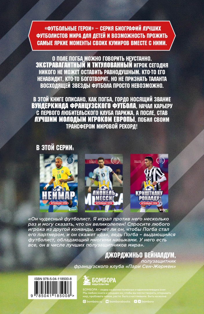 ОписаниеВ свои 29 лет Поль Погба стал одним из самых востребованных игроков на сегодняшний день. Какой клуб не хотел бы видеть у себя столь выдающегося полузащитника? О Поле Погба можно говорить неустанно. Экстравагантный и титулованный игрок сегодня никого не может оставить равнодушным. Кто-то его ненавидит, кто-то боготворит, но невозможно не признать таланта восходящей звезды футбола. В этой книге Погба, гордо носящий звание вундеркинда французского футбола, начинает карьеру с первого любительского клуба Парижа. Став лучшим молодым игроком Европы, он исполнил свою заветную мечту и вернулся в клуб «Манчестер Юнайтед», побив своим трансфером мировой рекорд!В свои 29 лет Поль Погба стал одним из самых востребованных игроков на сегодняшний день. Какой клуб не хотел бы видеть у себя столь выдающегося полузащитника? О Поле Погба можно говорить неустанно. Экстравагантный и титулованный игрок сегодня никого не может оставить равнодушным. Кто-то его ненавидит, кто-то боготворит, но невозможно не признать таланта восходящей звезды футбола. В этой книге Погба, гордо носящий звание вундеркинда французского футбола, начинает карьеру с первого любительского клуба Парижа. Став лучшим молодым игроком Европы, он исполнил свою заветную мечту и вернулся в клуб «Манчестер Юнайтед», побив своим трансфером мировой рекорд!