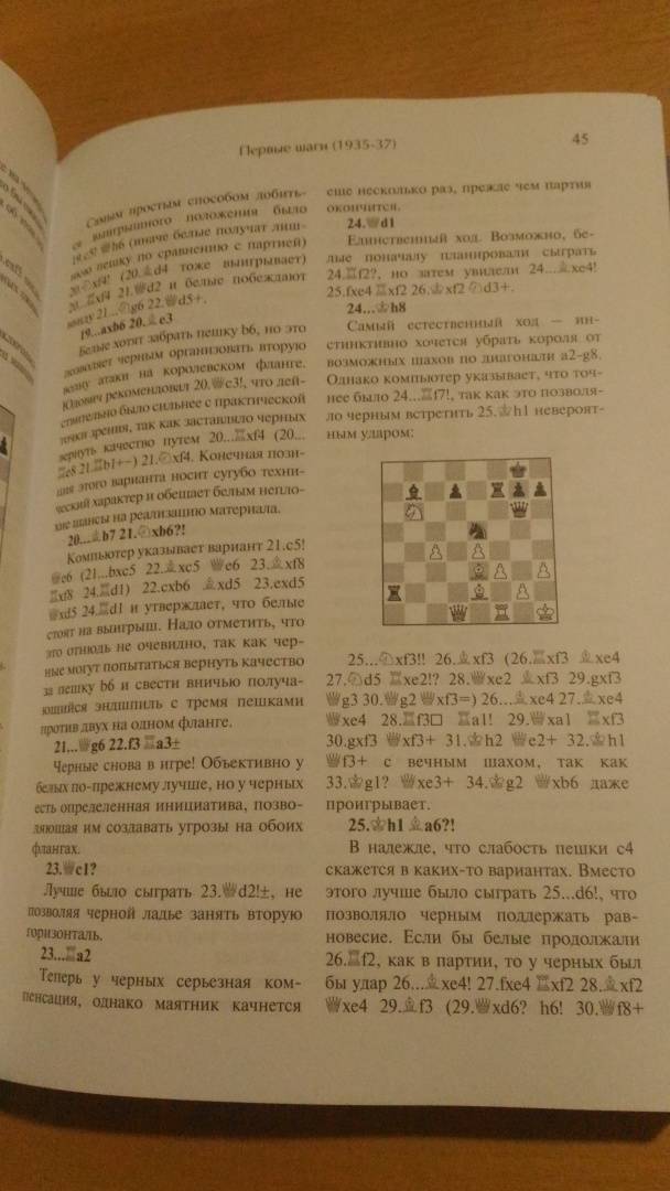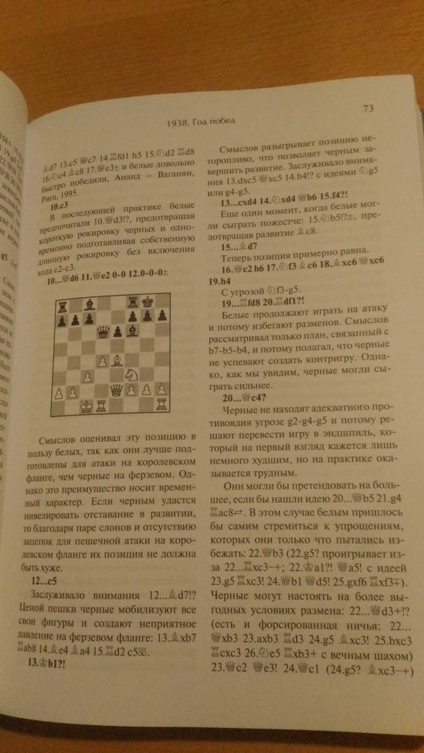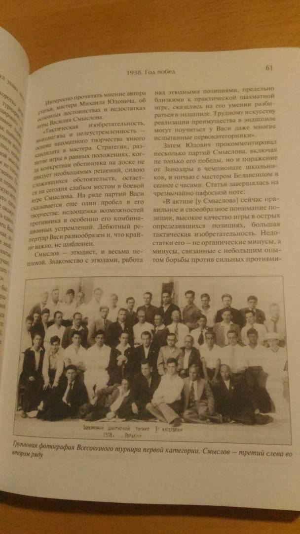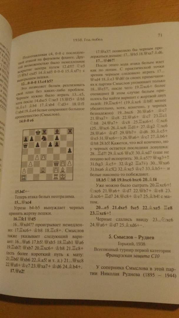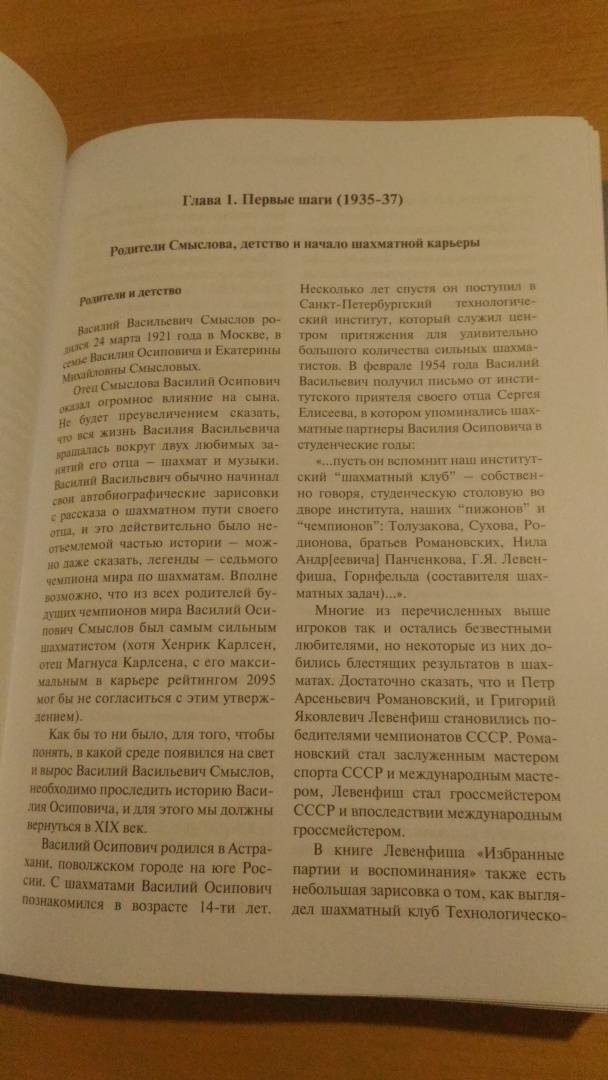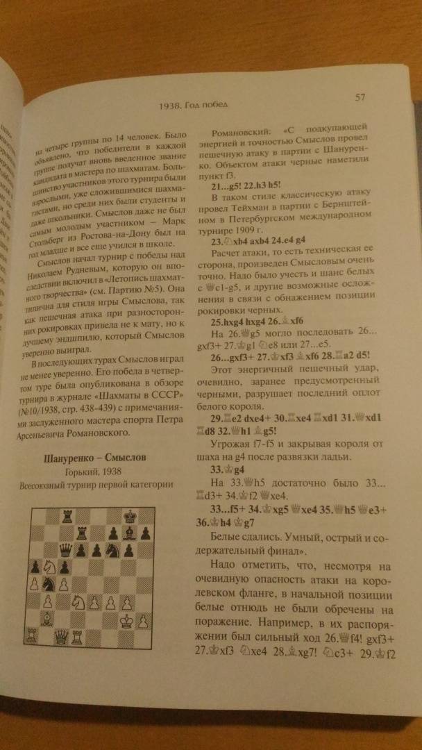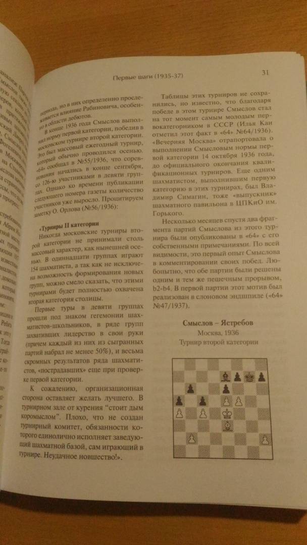 ОписаниеСедьмой чемпион мира Василий Васильевич Смыслов прожил долгую и насыщенную событиями жизнь. Он сыграл около 3000 турнирных партий за семь десятилетий и успел застать как эпоху Ласкера и Капабланки, так и времена Ананда и Карлсена. С 1948-го по 1958-й год Смыслов принял участие в четырех чемпионатах мира и стал чемпионом в 1957 году. Многие годы Смыслов продолжал играть на высочайшем уровне и добился невероятного успеха в начале 1980-х, пробившись в финальный матч претендентов. В первом томе многотомного исследования мастер ФИДЕ Андрей Терехов описывает годы становления Василия Смыслова - от первых турниров до звания гроссмейстера СССР и второго места в матч-турнире на первенство мира 1948 года. Благодаря доступу к семейным архивам Смыслова рассказ о шахматной юности Василия Васильевича сопровождается десятками прекрасных фотографий, часть из которых публикуется впервые, а также 49 глубоко проанализированными партиями. Специально написанная для этого издания статья немецкого гроссмейстера Карстена Мюллера об эндшпильной технике Смыслова завершает первый том. "Эта книга является результатом очень глубокого исследования жизни и творчества седьмого чемпиона мира, и благодаря этому стала долгожданным вкладом в литературу о Смыслове" (из Предисловия Петра Свидлера).Для широкого круга любителей шахмат.СвернутьСедьмой чемпион мира Василий Васильевич Смыслов прожил долгую и насыщенную событиями жизнь. Он сыграл около 3000 турнирных партий за семь десятилетий и успел застать как эпоху Ласкера и Капабланки, так и времена Ананда и Карлсена. С 1948-го по 1958-й год Смыслов принял участие в четырех чемпионатах мира и стал чемпионом в 1957 году. Многие годы Смыслов продолжал играть на высочайшем уровне и добился невероятного успеха в начале 1980-х, пробившись в финальный матч претендентов. В первом томе многотомного исследования мастер ФИДЕ Андрей Терехов описывает годы становления Василия Смыслова - от первых турниров до звания гроссмейстера СССР и второго места в матч-турнире на первенство мира 1948 года. Благодаря доступу к семейным архивам Смыслова рассказ о шахматной юности Василия Васильевича сопровождается десятками прекрасных фотографий, часть из которых публикуется впервые, а также 49 глубоко проанализированными партиями. Специально написанная для этого издания статья немецкого гроссмейстера Карстена Мюллера об эндшпильной технике Смыслова завершает первый том. "Эта книга является результатом очень глубокого исследования жизни и творчества седьмого чемпиона мира, и благодаря этому стала долгожданным вкладом в литературу о Смыслове" (из Предисловия Петра Свидлера).Для широкого круга любителей шахмат.СвернутьСвернуть
