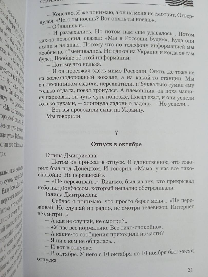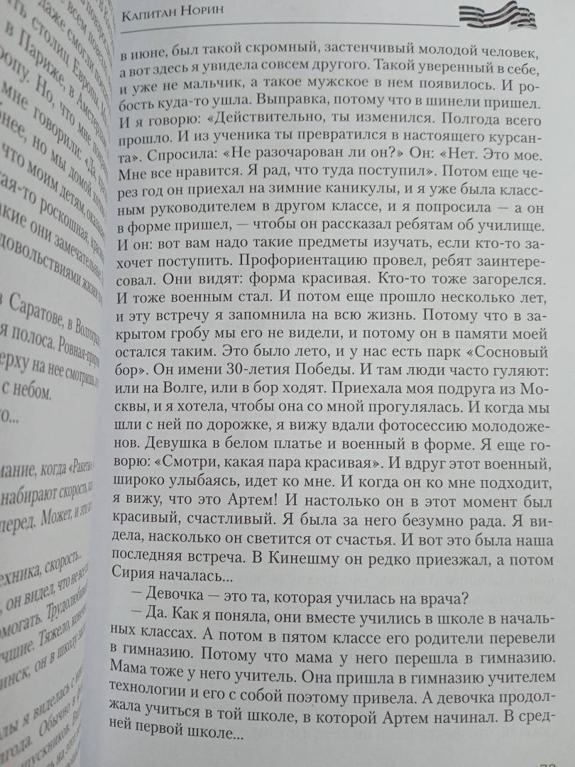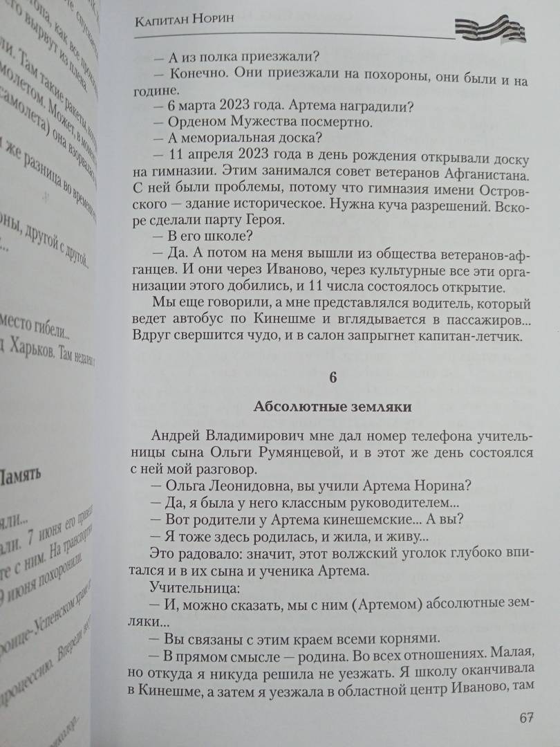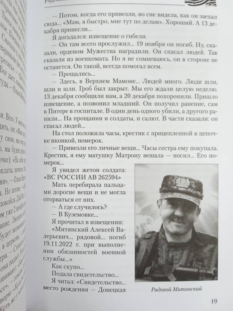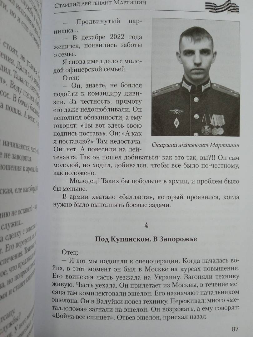 Описание"Солдатами не рождаются, солдатами становятся. Становятся по характеру, становятся по судьбе…" Книга посвящена судьбам погибших и живых простых "тружеников войны", уже третий год свершающих свой ратный подвиг на полях СВО. Читатель узнает о погибших героях: сержанте Шипилове, прошедшем Чечню и Абхазию; капитане Норине, влюбленном в небо, штурмане бомбардировщика; старшем лейтенанте Мартишине, собиравшем в тылу врага ценнейшую информацию; вагнеровце с позывным "Писарро", воевавшем в Чечне и Африке, освобождавшем Бахмут; старшем лейтенанте Трундаеве, защищавшем Донбасс в 2014 г., ученики которого сейчас освобождают Украину. А также о живых: майоре Ершове, со своими морпехами штурмовавшем Мариуполь; капитане Сергее, на протезах, после тяжелого ранения, продолжившем службу в медчасти; майоре милиции Львове, прошедшем две чеченских войны, ныне заботящемся о раненых в госпитале и бойцах на передовой…"Солдатами не рождаются, солдатами становятся. Становятся по характеру, становятся по судьбе…" Книга посвящена судьбам погибших и живых простых "тружеников войны", уже третий год свершающих свой ратный подвиг на полях СВО. Читатель узнает о погибших героях: сержанте Шипилове, прошедшем Чечню и Абхазию; капитане Норине, влюбленном в небо, штурмане бомбардировщика; старшем лейтенанте Мартишине, собиравшем в тылу врага ценнейшую информацию; вагнеровце с позывным "Писарро", воевавшем в Чечне и Африке, освобождавшем Бахмут; старшем лейтенанте Трундаеве, защищавшем Донбасс в 2014 г., ученики которого сейчас освобождают Украину. А также о живых: майоре Ершове, со своими морпехами штурмовавшем Мариуполь; капитане Сергее, на протезах, после тяжелого ранения, продолжившем службу в медчасти; майоре милиции Львове, прошедшем две чеченских войны, ныне заботящемся о раненых в госпитале и бойцах на передовой…
